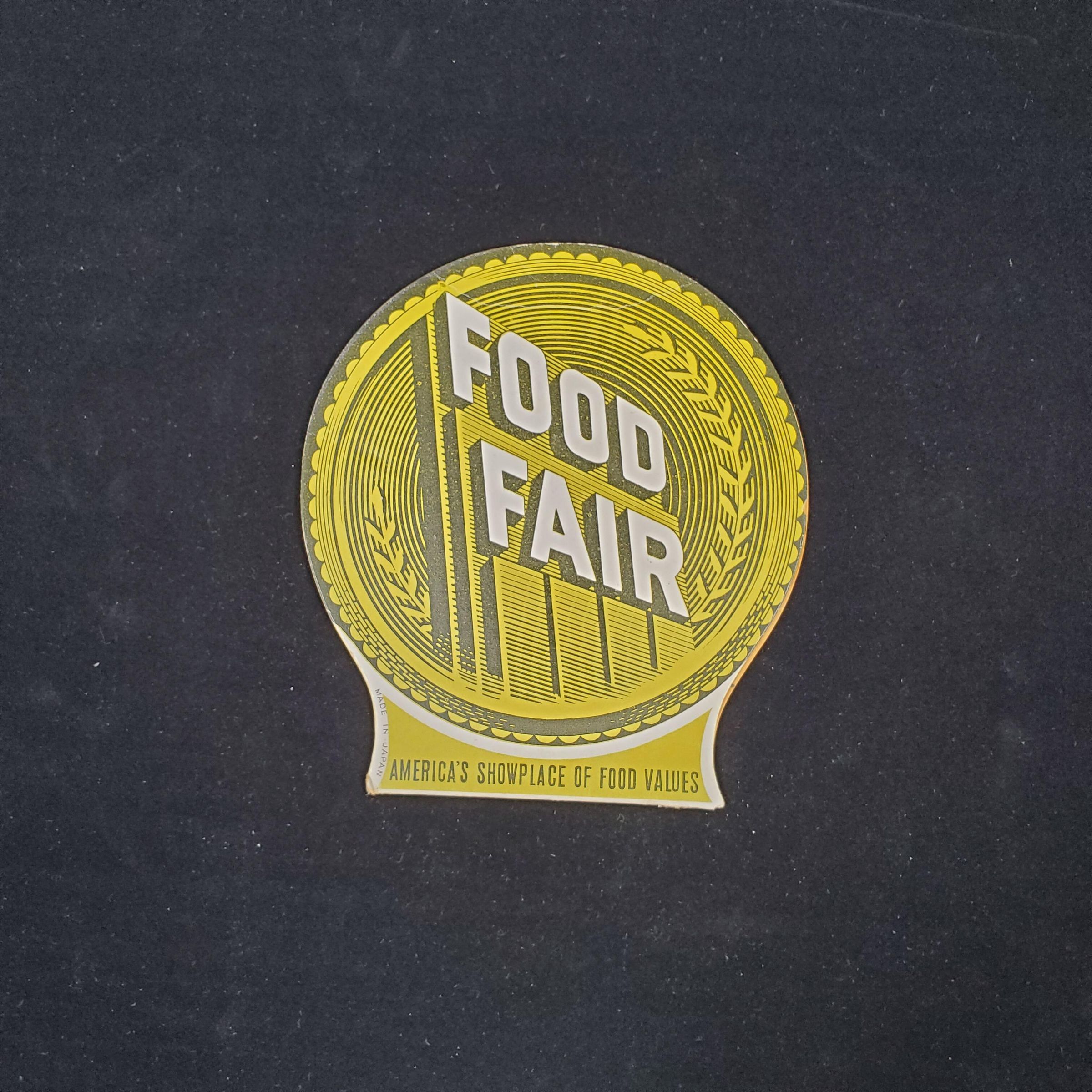 Cardbard needle packet, Advertising. Colours gold, black, white.Round book with base. Cover shows grains of wheat and reads ÒFood FairÓÕ AmericaÕs Showplace of Food ValuesÓ, Back and front same,. Inside 6 foil backed areas for needles, one for needle threader.Made in Japanprinyed on cover.
