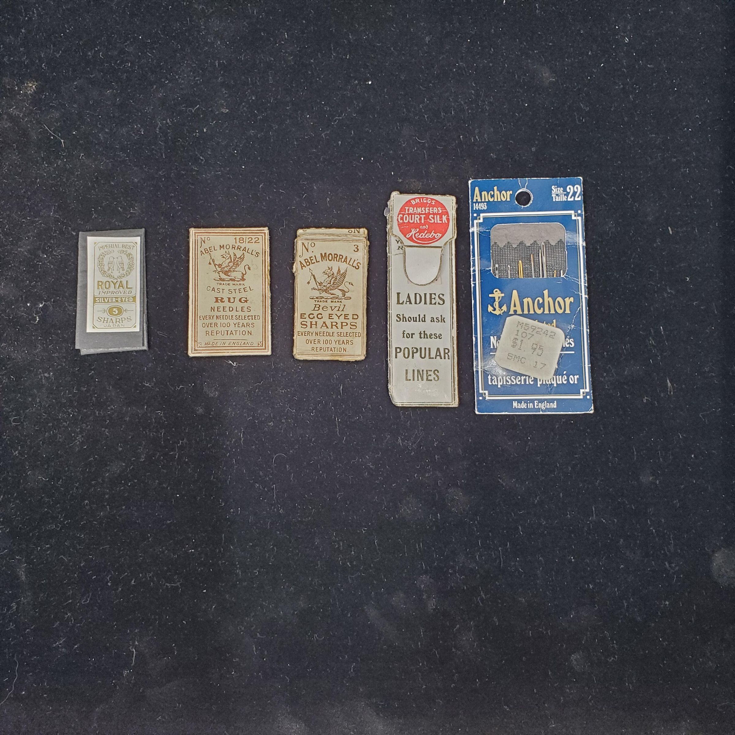 5 needle packets of various sizes and makes 1) Briggs Assorted Bodkins2)Anchor Needlepoint Needles3)Abel Morralls Cast Steel Rug Needles4)Abel MorrallÕs Bevil Egg Eyed Sharps5)Royal improved Silver-eyed sharps.