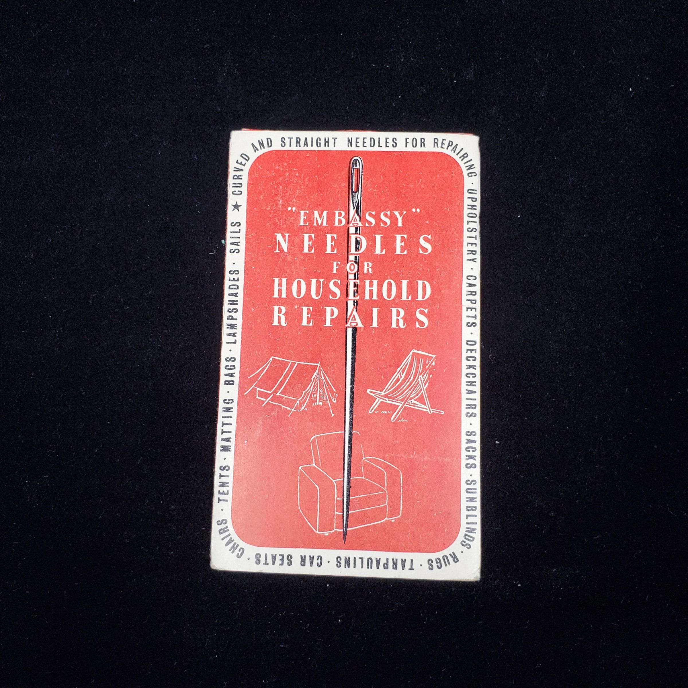 Cardboard needle packet. Colours - red, white and black. Cover red with white or black print. On front ÒEmbasy Needles For Household RepairsÓ with sketches of chairs and black print advertising around outside.. Pictures of types of needles on back cover. Inside 5 types of needles on red cardboard, white print descriptions - all under plastic.
