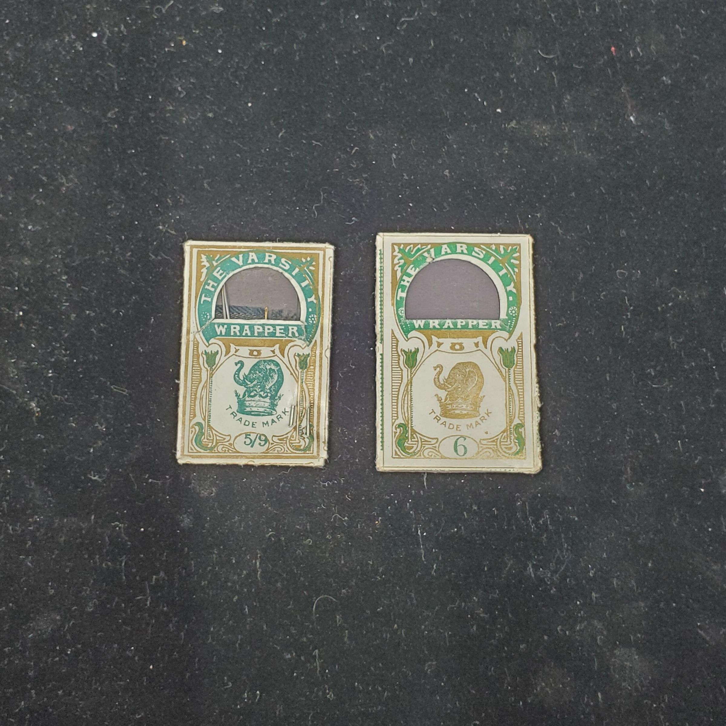 2 packets needles 1) The Varsity Wrapper = white green and gold colours Trademark or logo on wrapper and sizes 5/9 2) The Varsity Wrapper - white green gold packet. Trademark colour opposite of first one. Size 6