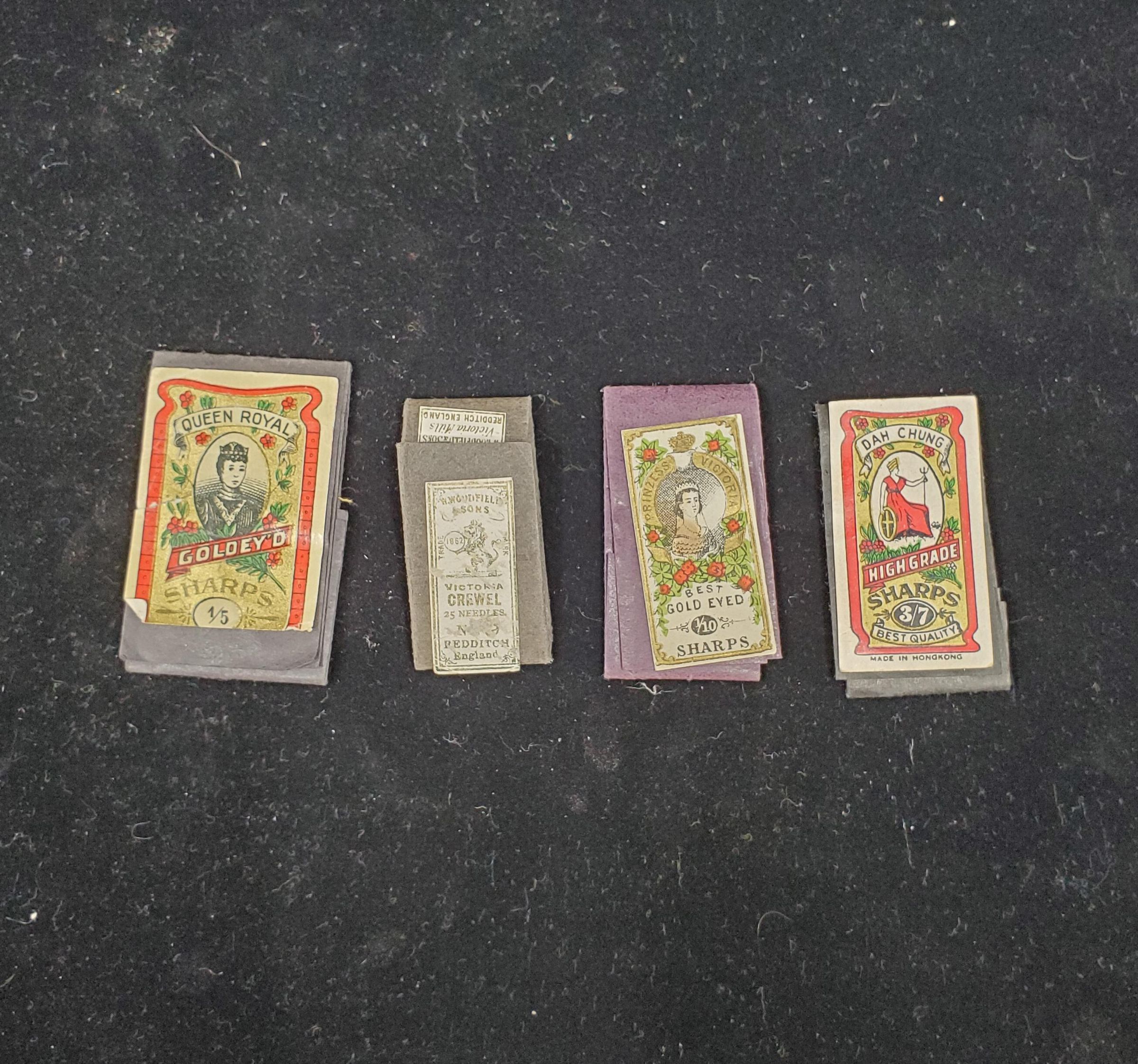 1) Queen RoyalGoldeyeÕd Sharps with picture Black, red colours. 2) Dah Chung High Grade Sharps Best Qua;ity 3/7 Made in Hong Kong Picture black & red colours 3)Princess Victoria Best Gold Eyed 3/10 Sharps Picture Red, green and black colours. 4)W.W.Goodfield & Sons Victoria Crewel 25 Needles Redditch England Logo Gimbel Brothers 5 cents.