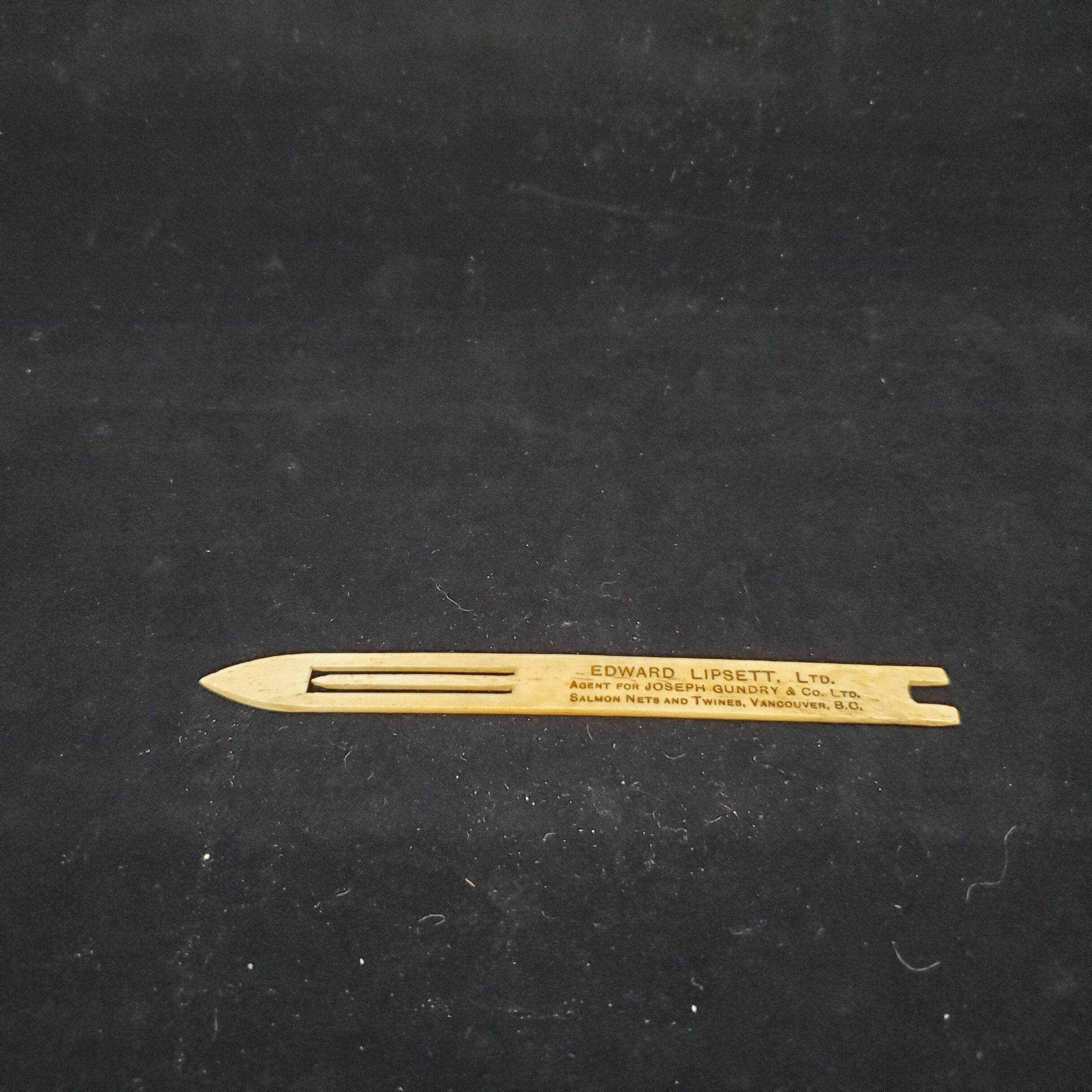 Advertising bone netting tool. Cream coloured with markings. Advertising in black print one side ÒEdward Lipsett Ltd. Agent for Joseph Gundry & Co.Ltd. Salmon Nets & Twines, Vancouver, B.C.Ó