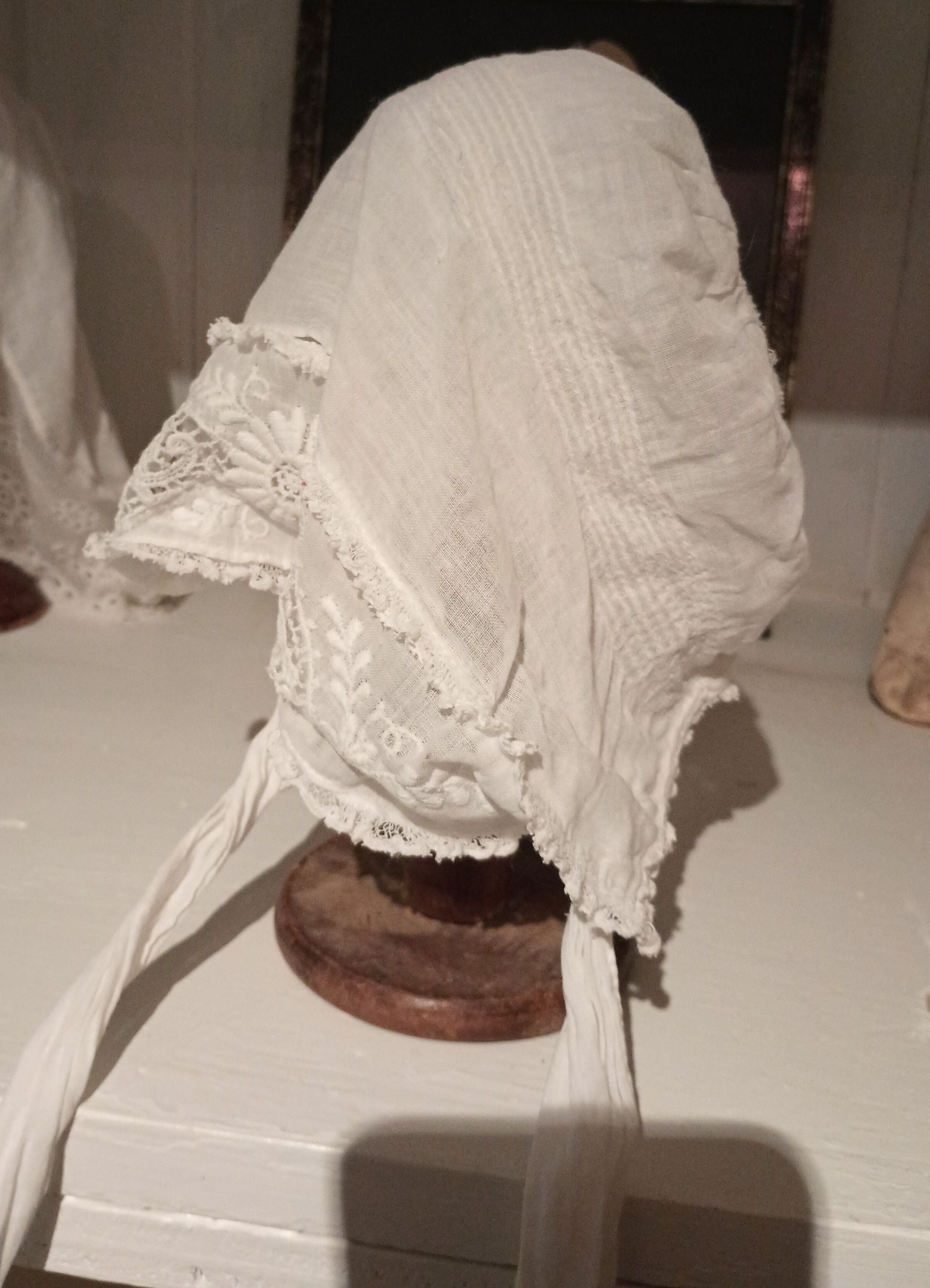 Cotton bonnet style nighcap with lace and tuck detailing.