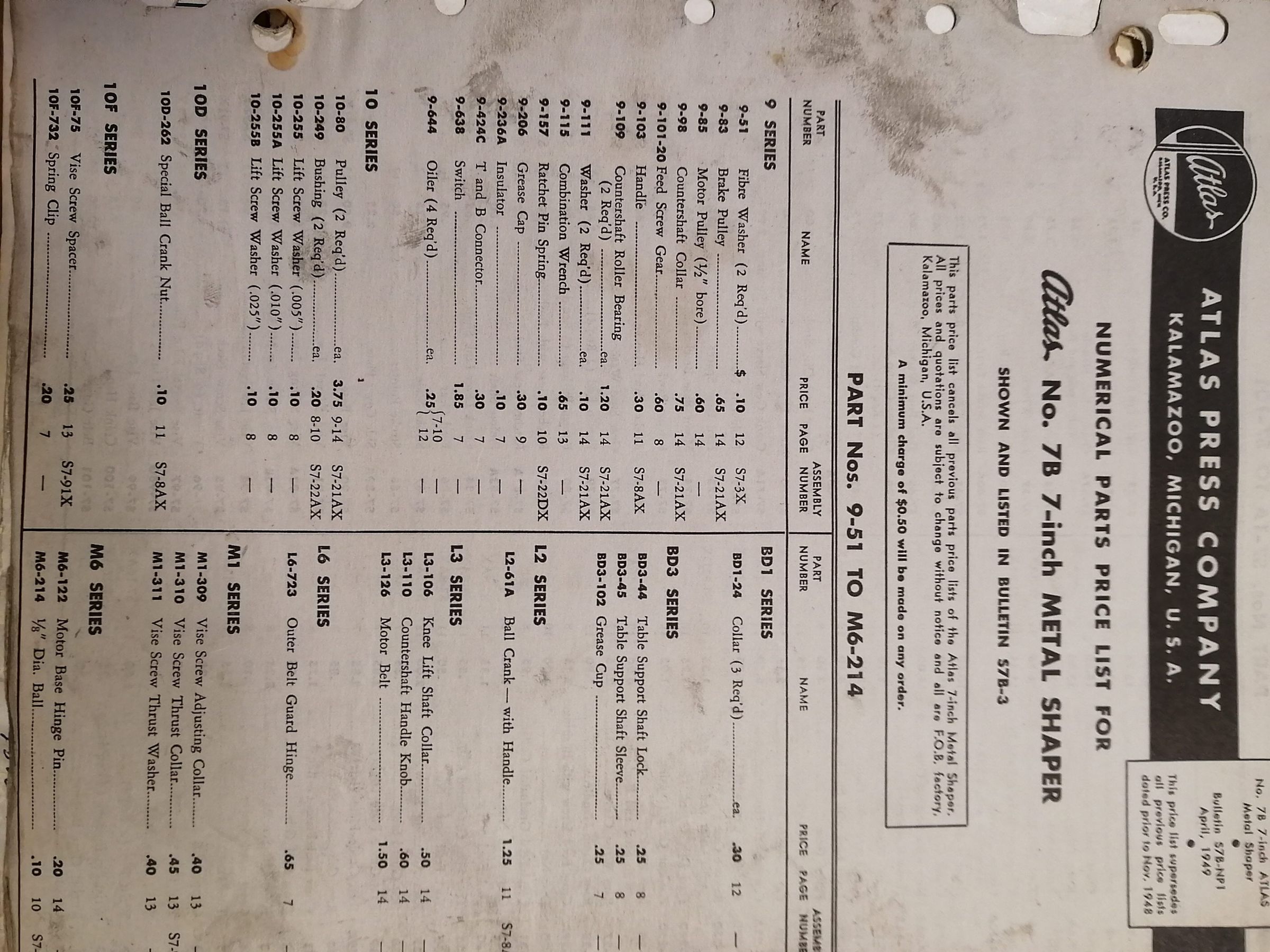 Numerical parts price list for Atlas