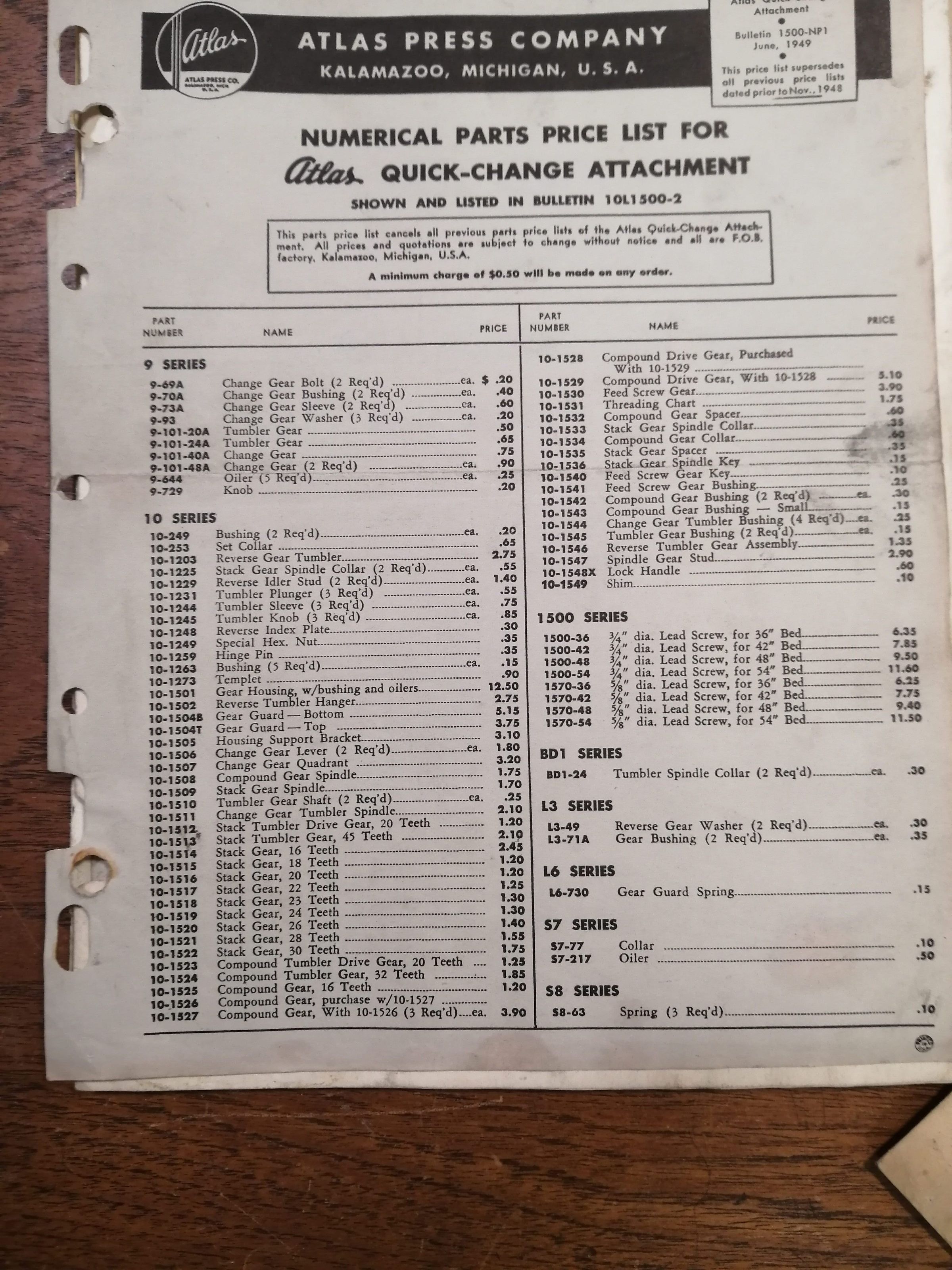 Numerical parts price list for Atlas quick change attachment