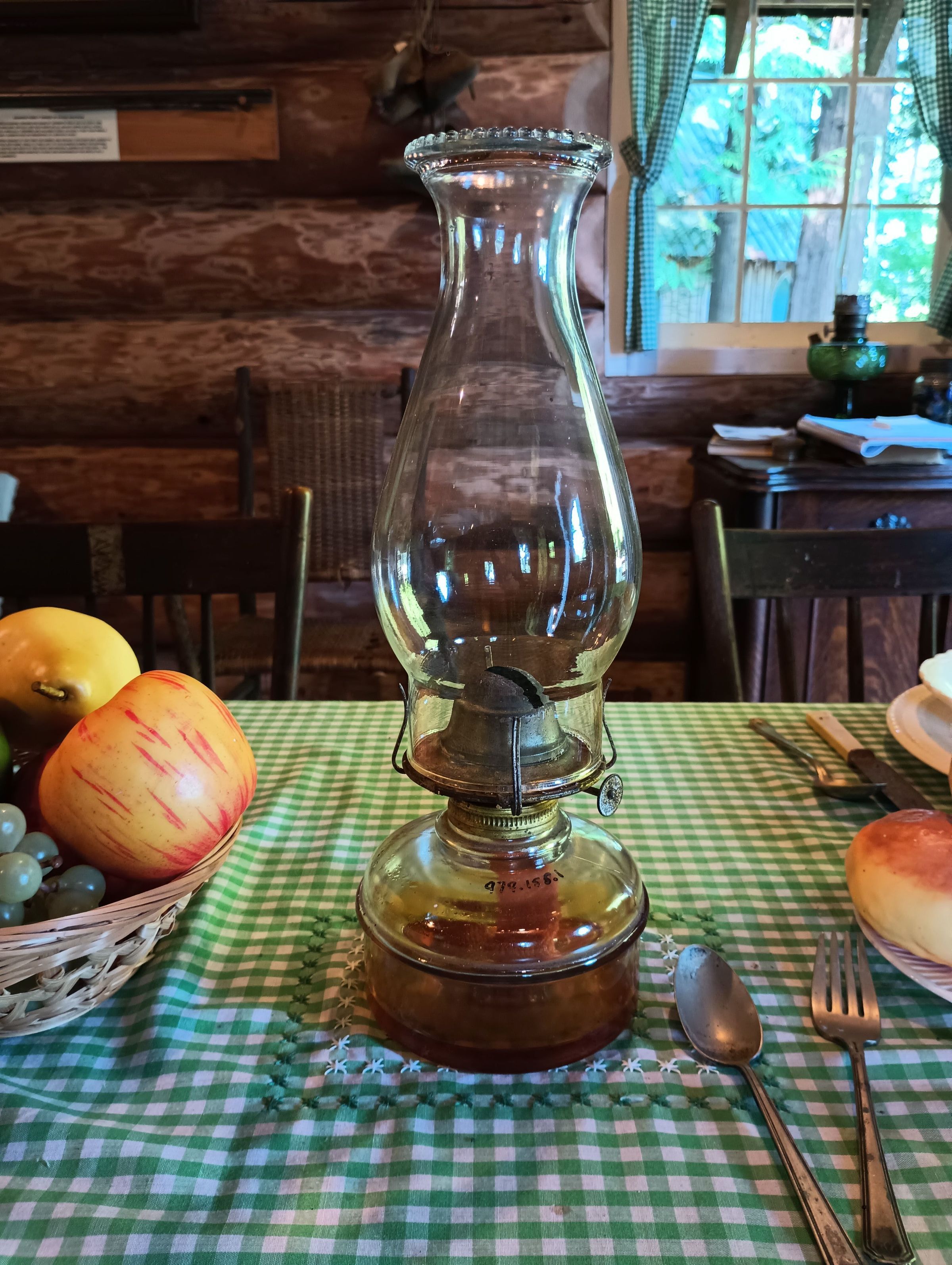 Oil lamp with clear glass base and chimney.