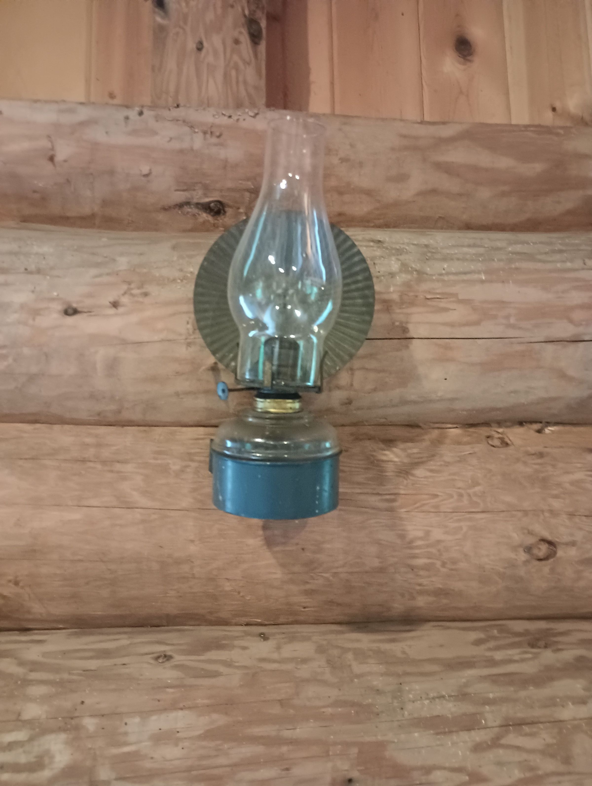 Wall mounted oil lamp with reflector and chimney.