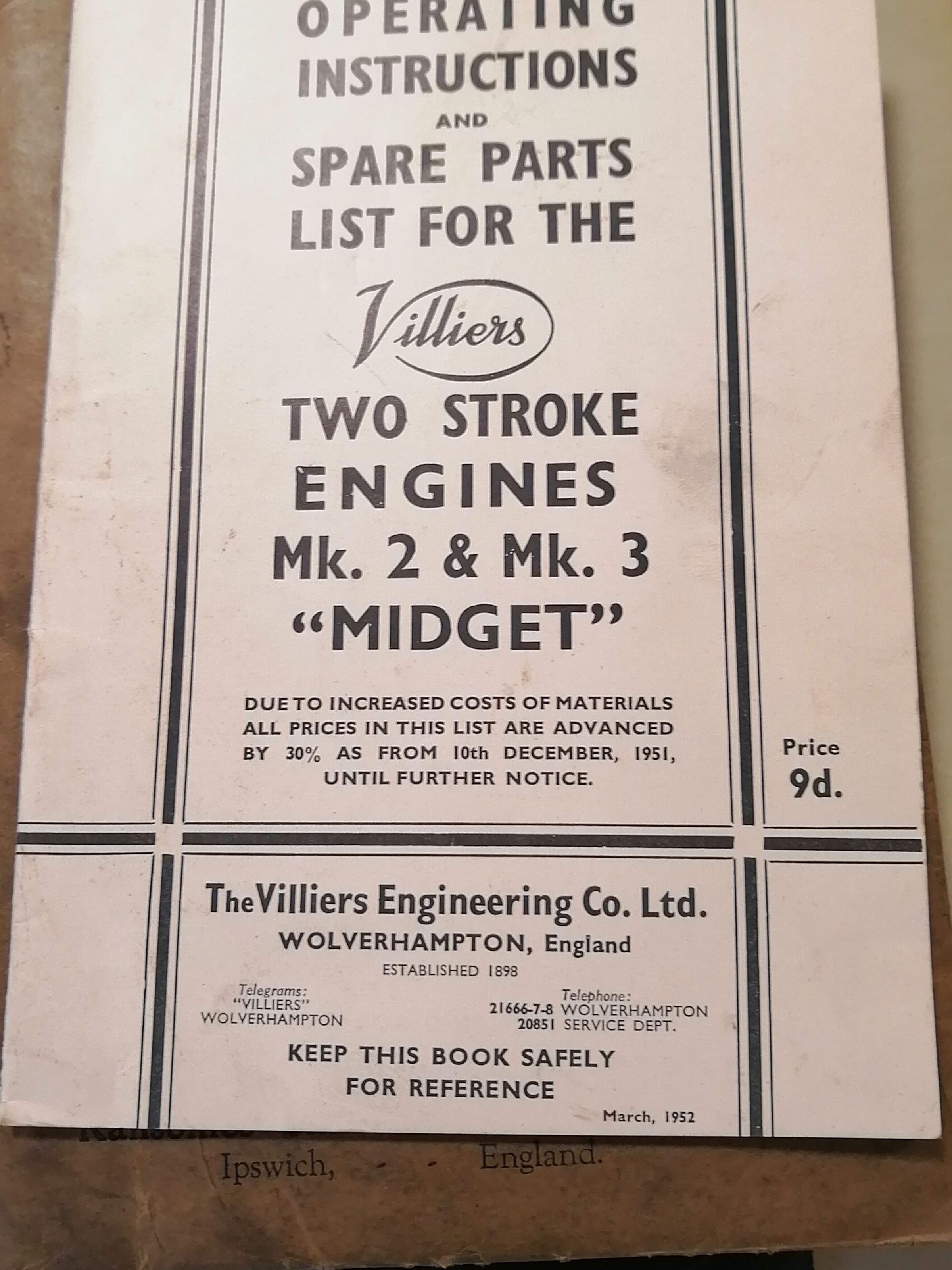 Operating instructions and spare parts list for the Villiers two stroke engines Mk. 2 and Mk. 3 Midget