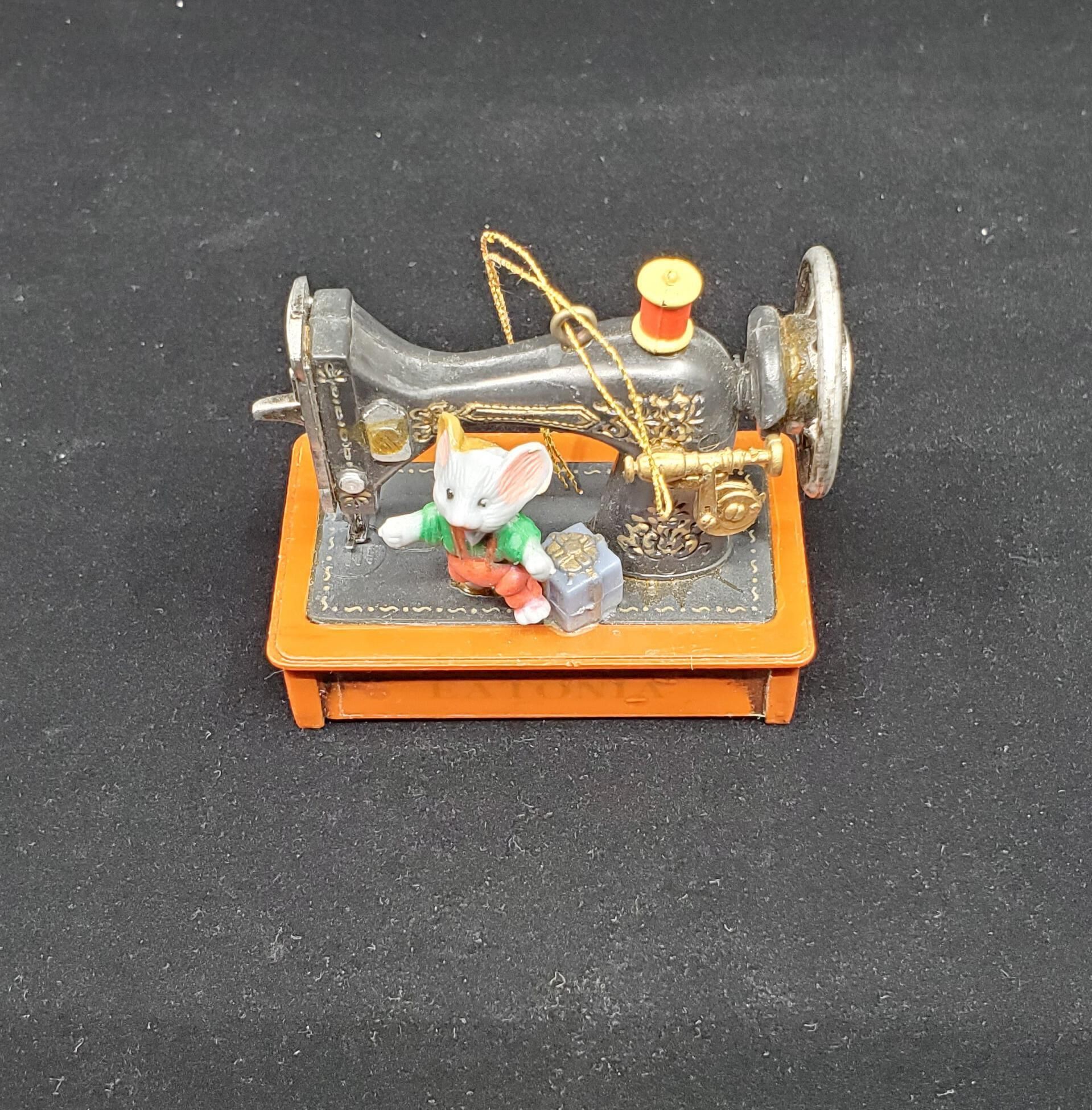 Plastic brown based sewing machine, black and silver. Has small mouse and parcel in front. Base is stamped in gold print ÒEatoniaÓ (T.Eaton Co. Can.) On bottom Made in China. Hanger from top of machine