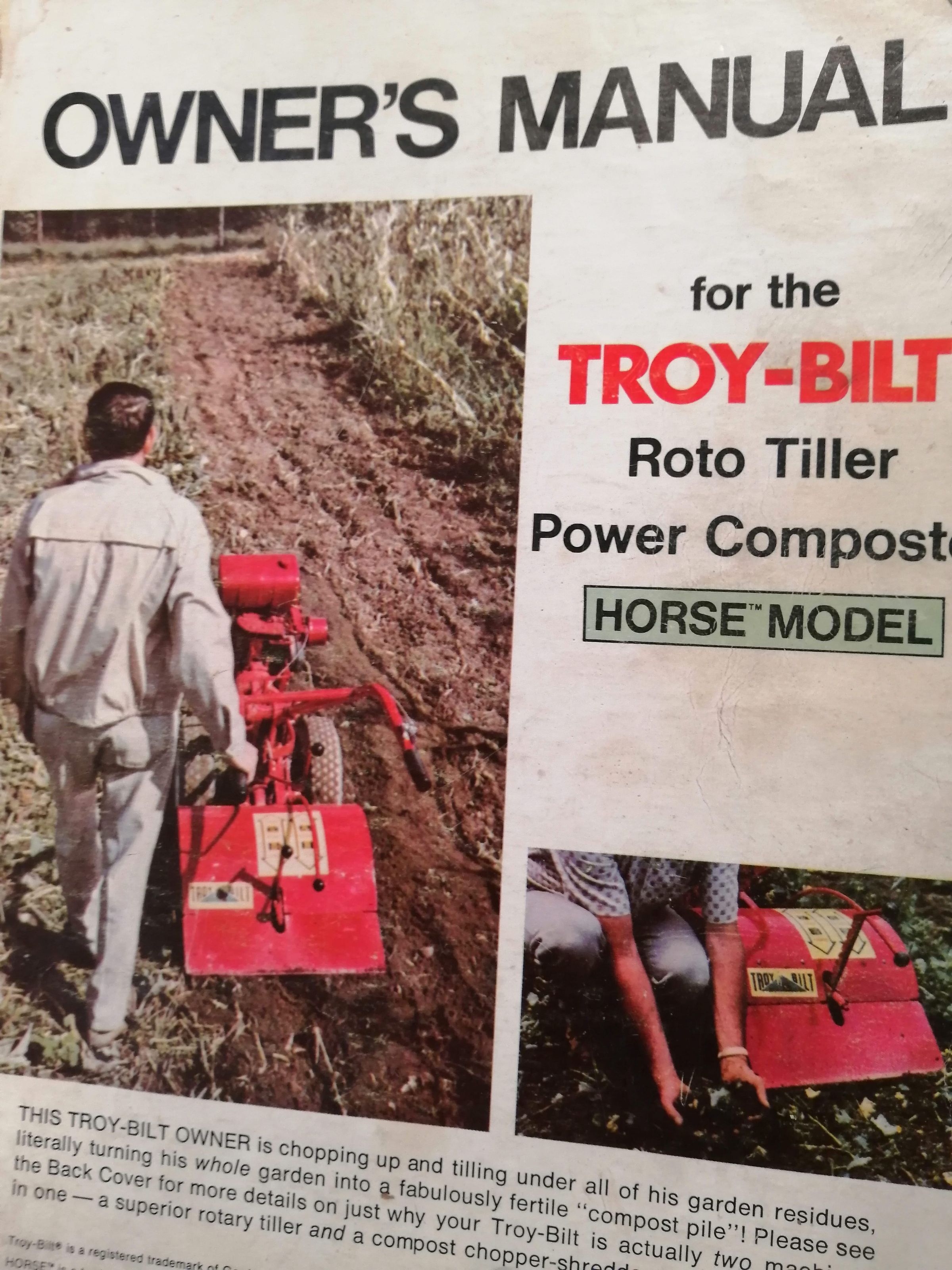 Owners manual for the Troy-Bilt roto tiller, power composter. Horse model.