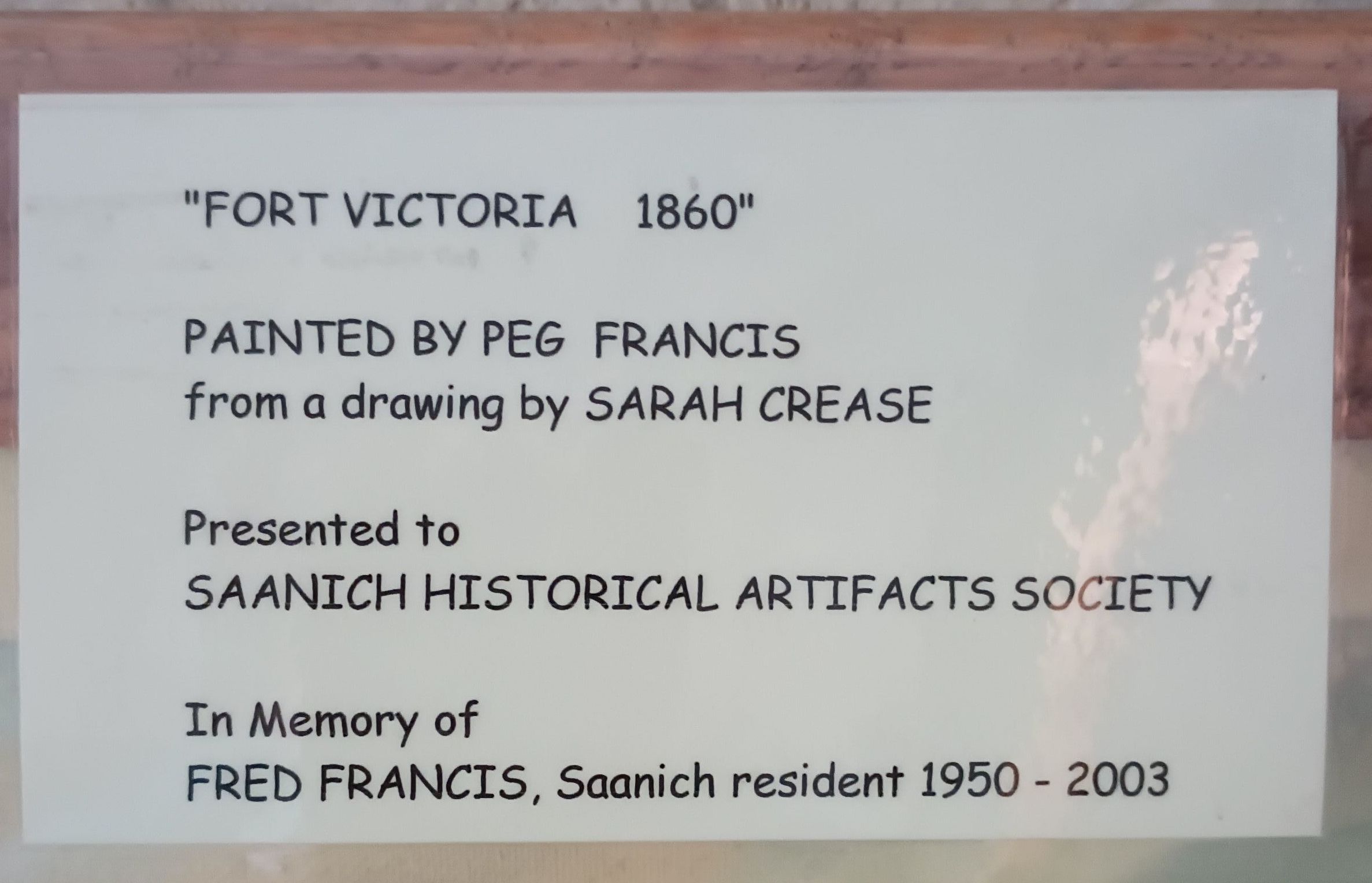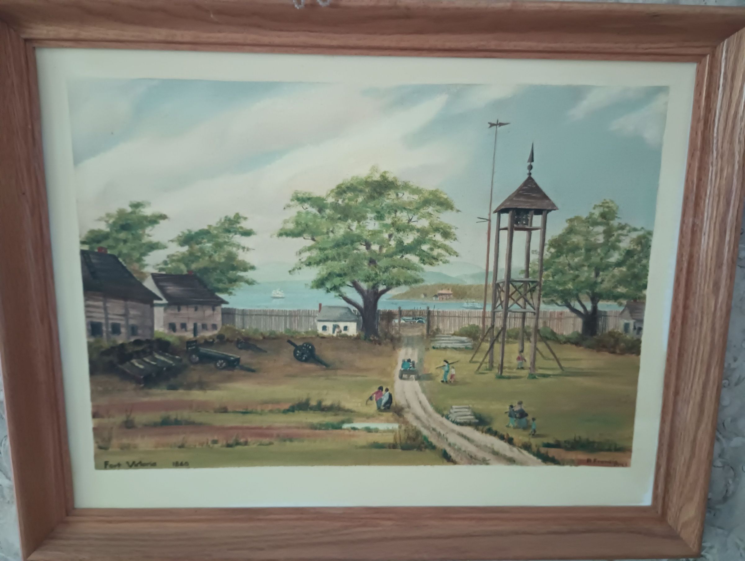 Framed oil painting of Fort Victoria in 1860 by Peg Francis from a drawing by Sarah Crease.