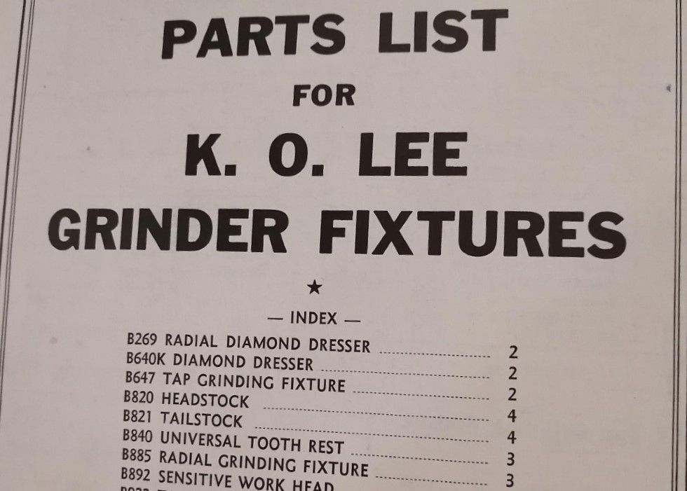 Parts list for K. O. Lee grinder fixtures