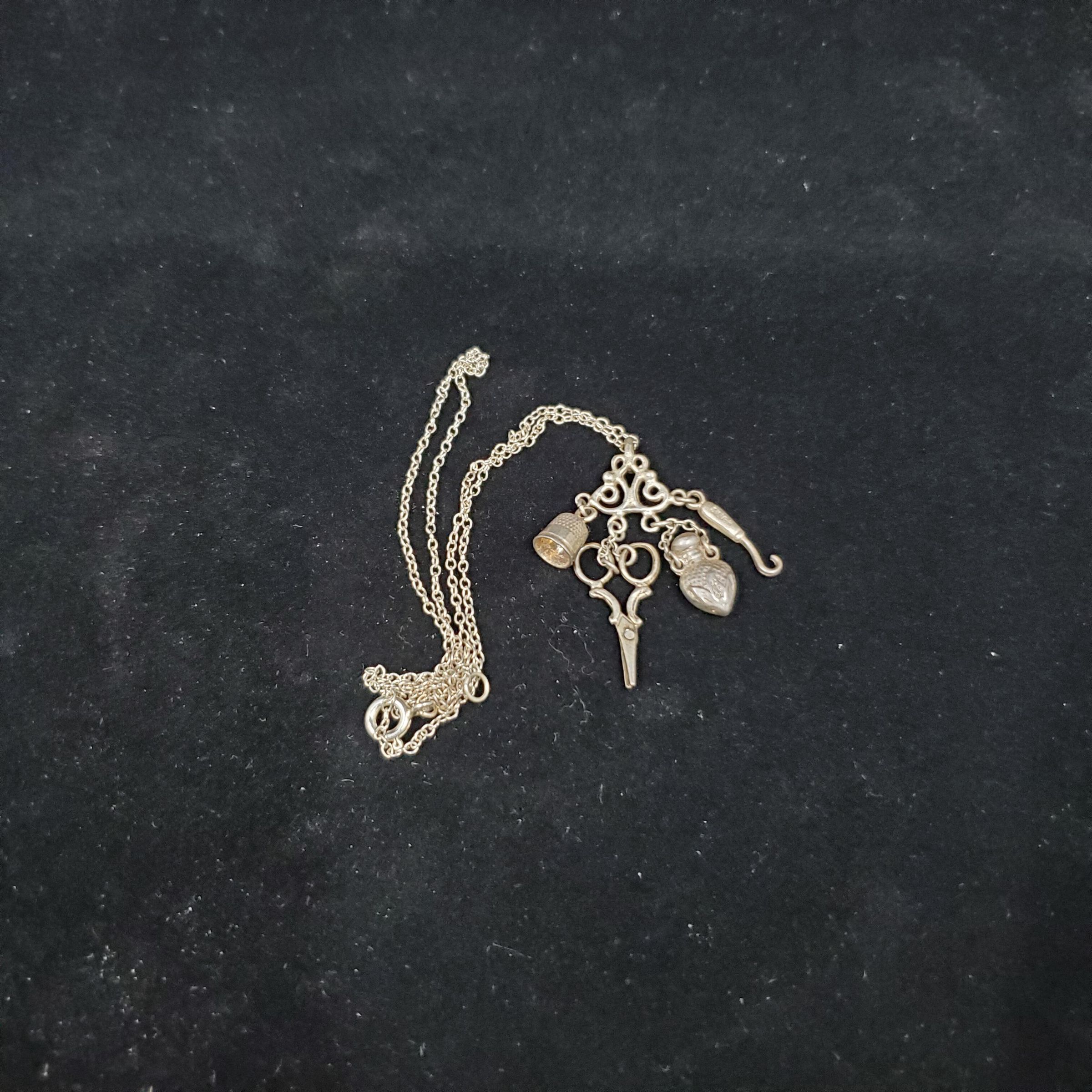 Silver chatelaine pendant - miniature chatelaine. Silver chain with thmble, needle case, hook and opening scissors -all minis. Victorian style. In Past Times Box
