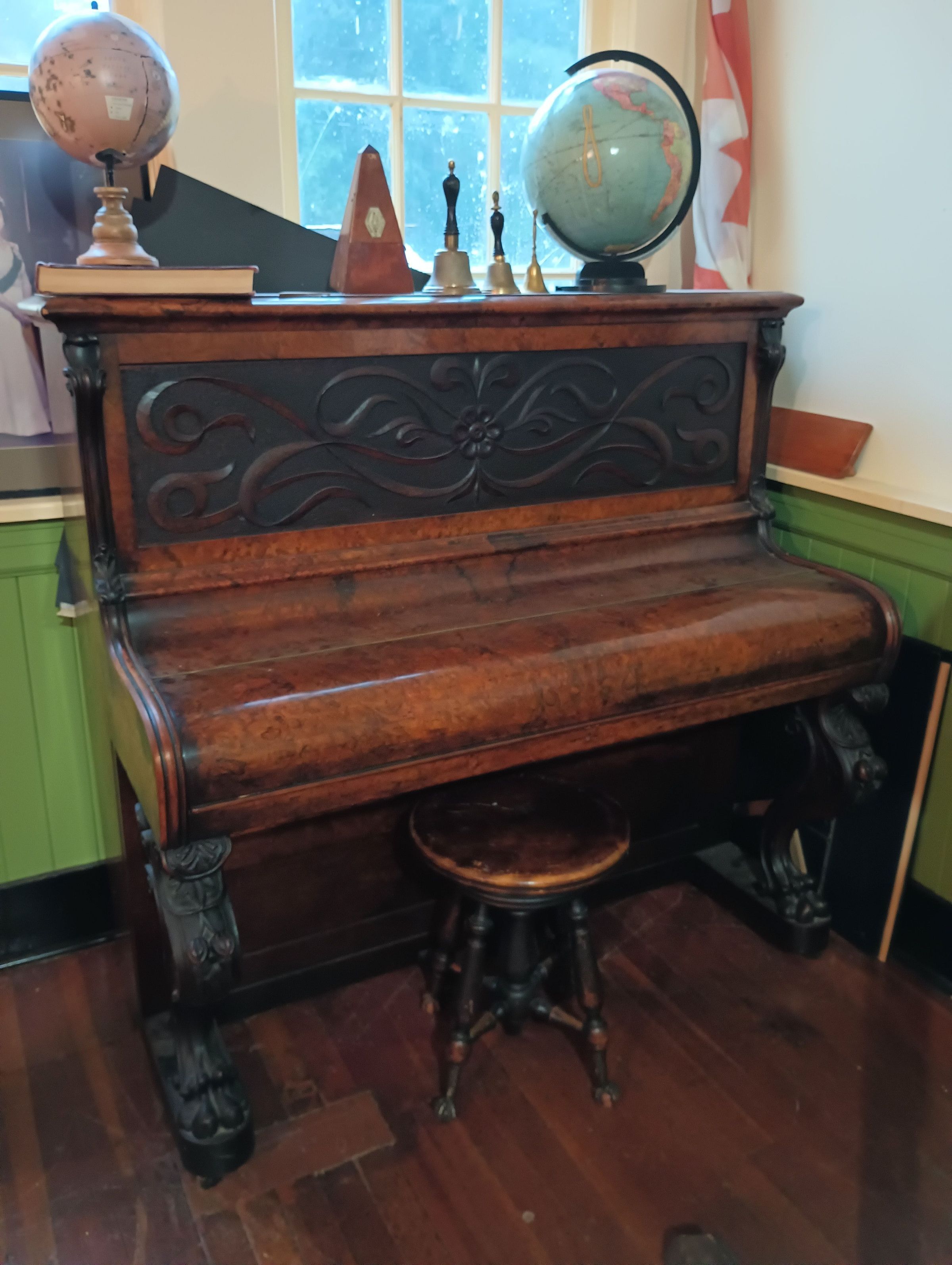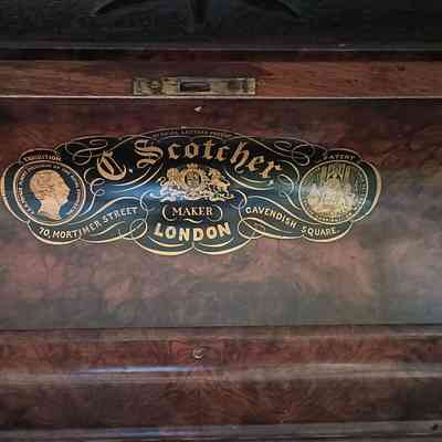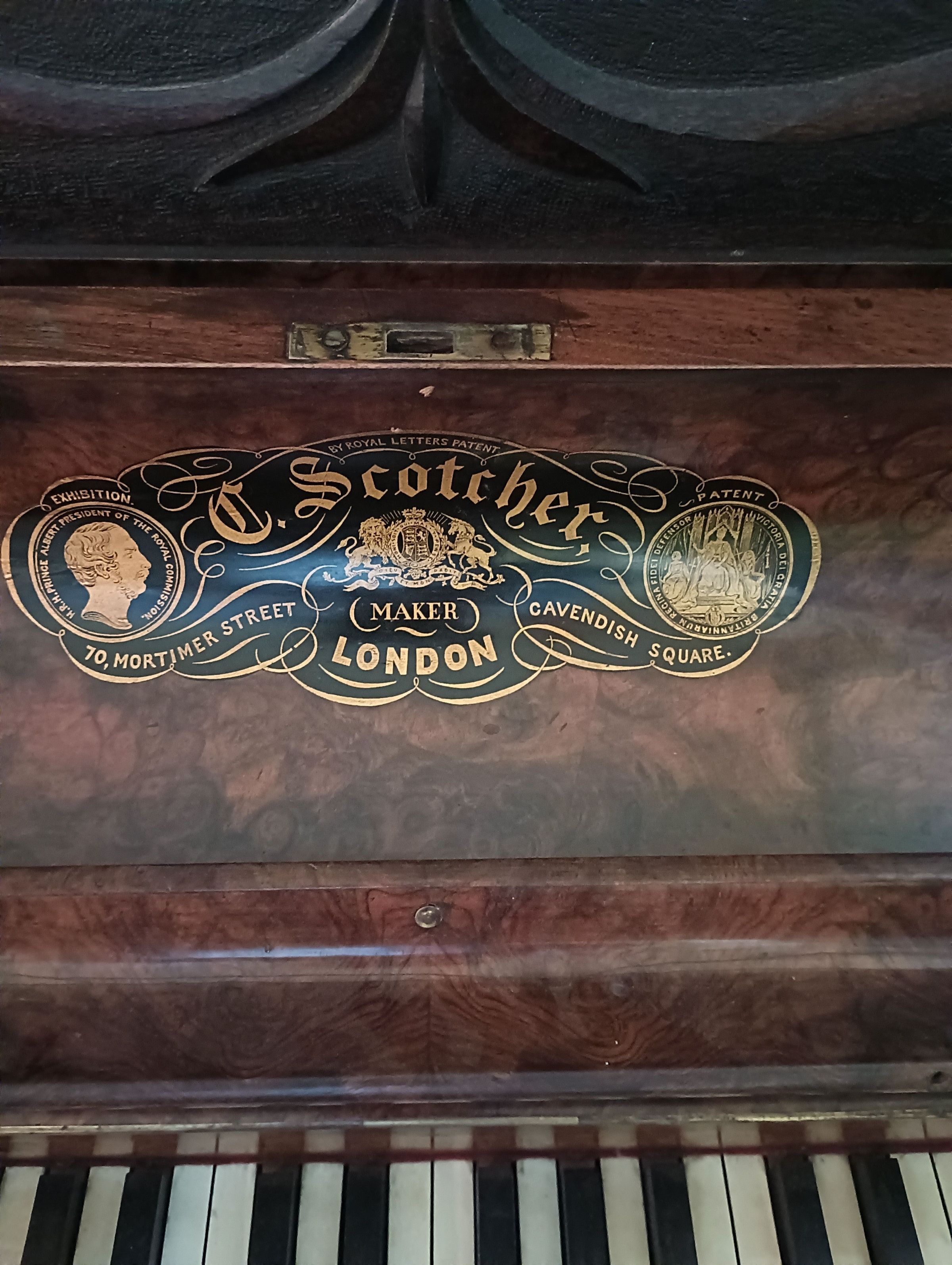 Upright mahogany and ebony piano manufactured by C. Scotcher, London England.Context
