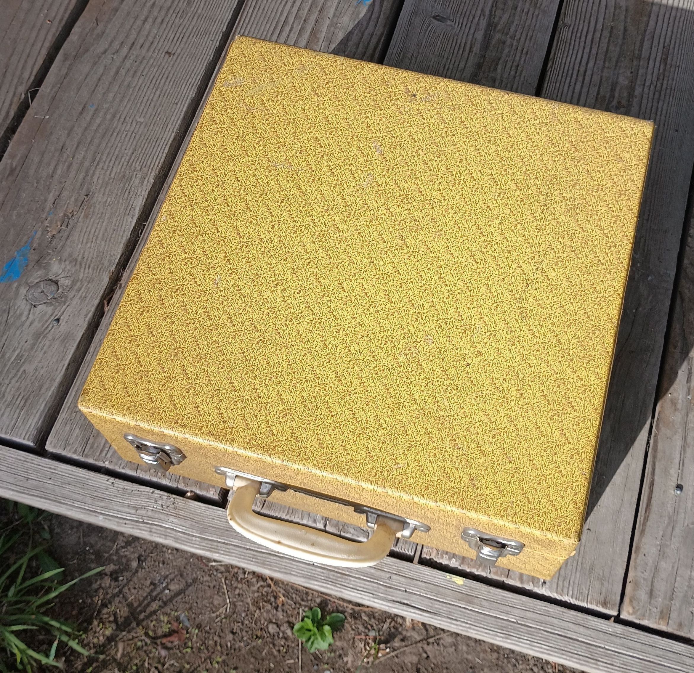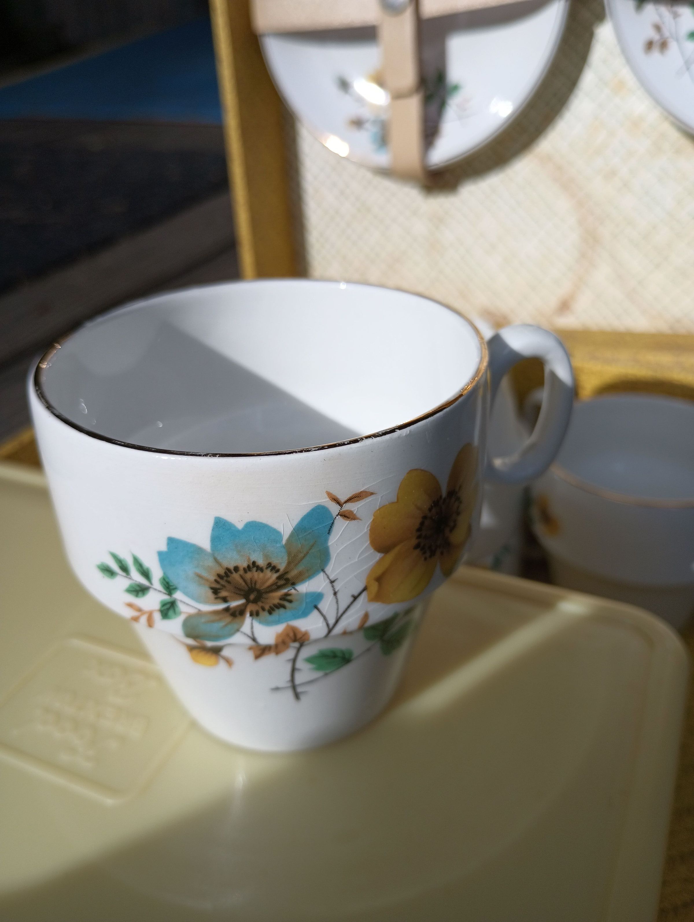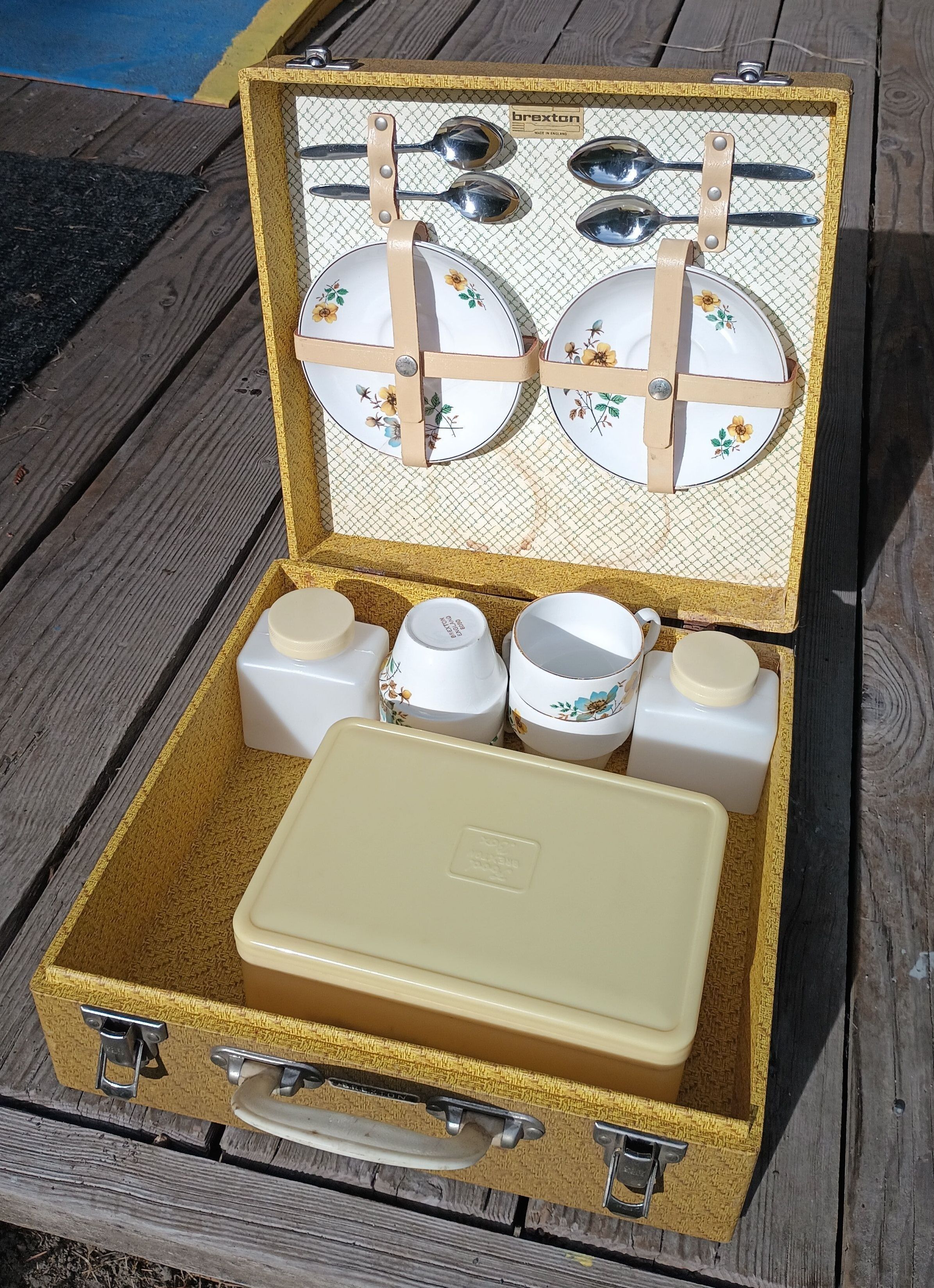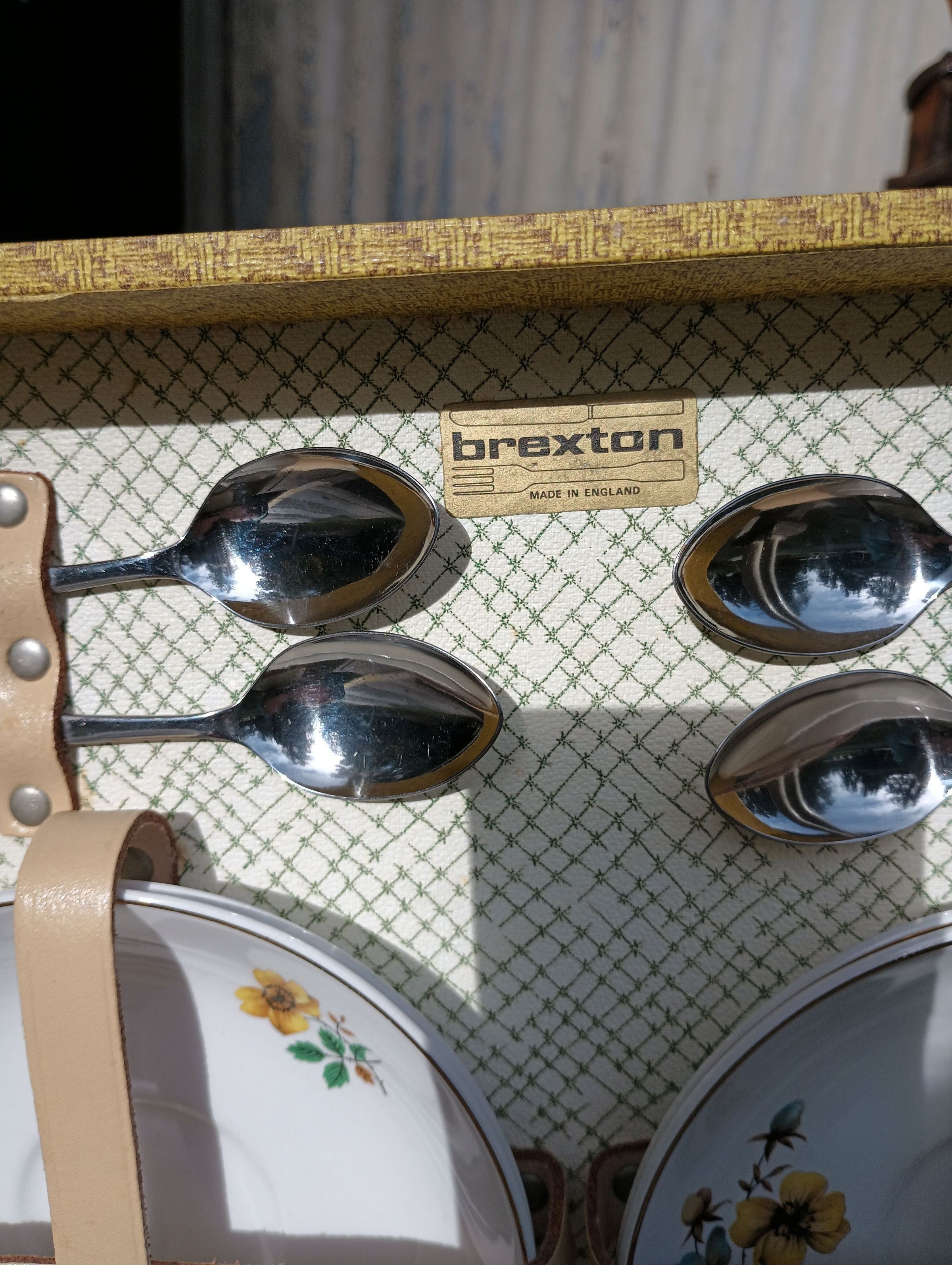 Set of four china tea cups and saucers with spoons and three plastic containers for food in a suitcase. Manufactured by Brexton, England.circa 1950's 1960's
