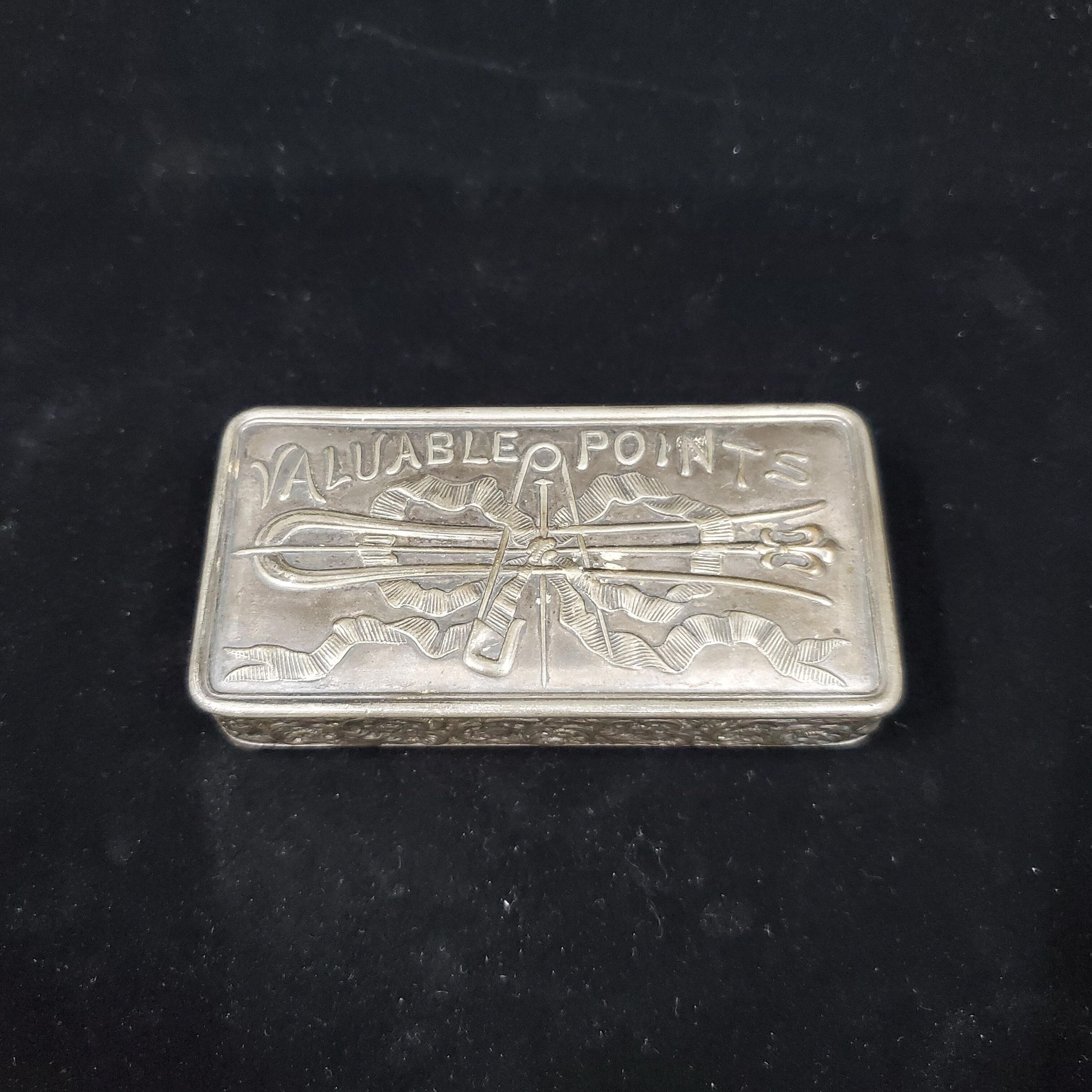 Silver plate pin box. Heavy. Sits on 4 round 1/4Ó legs. Sides heavily embossed in patternn. Top has raised bow with safety pin, common pin, hair pin.Stamped on bottom ÒQuadruple Plate Meriden Silver PlateÓ with logo of standing lion in center of circle. Hinged Top. Inside plain.