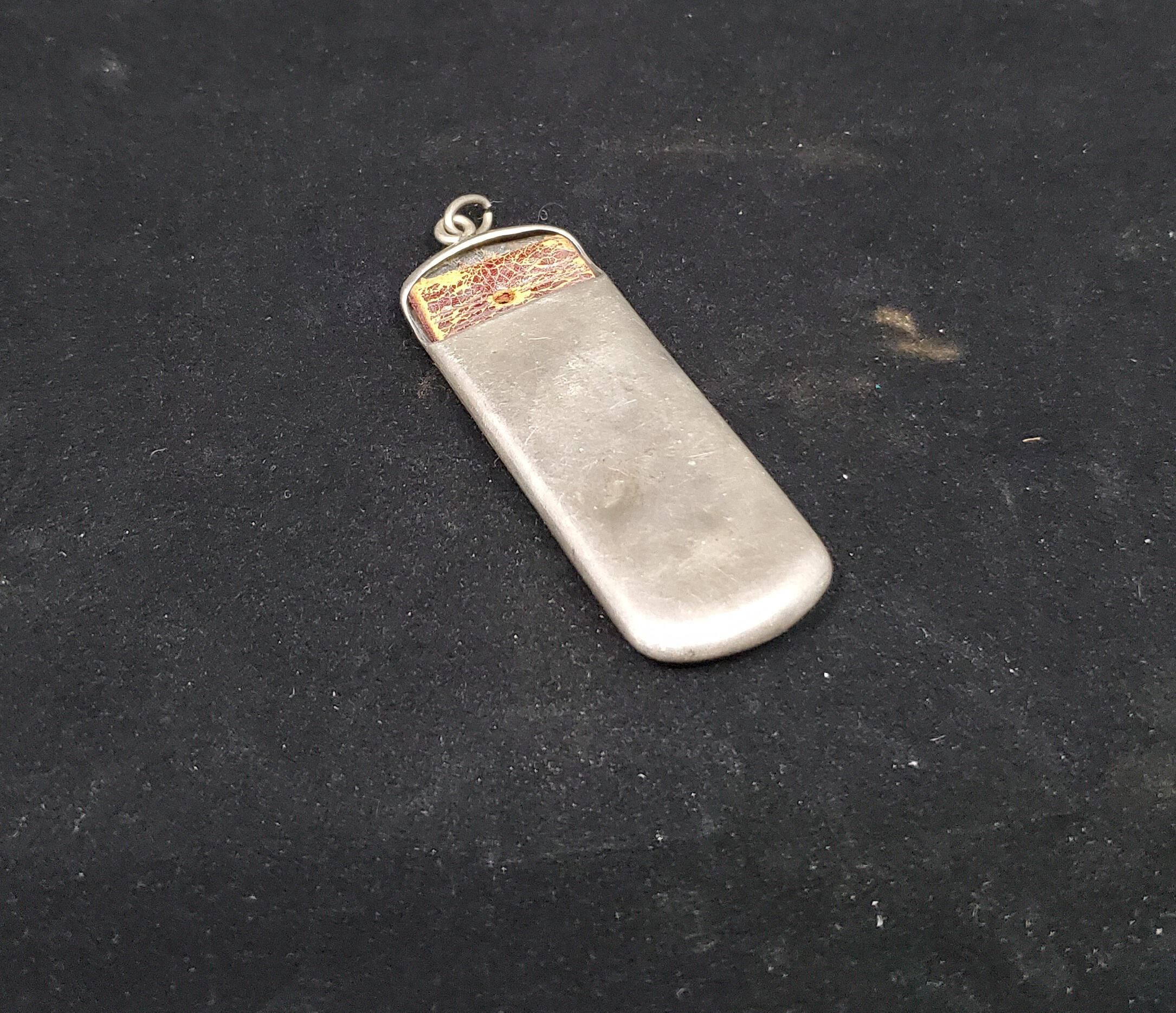 Silver pin case. Sterling silver case with hanging loop at top. Inside a lined leasther folder. Dark brown leather with a maroon coloured moire material as lining. Holes at top of fold.