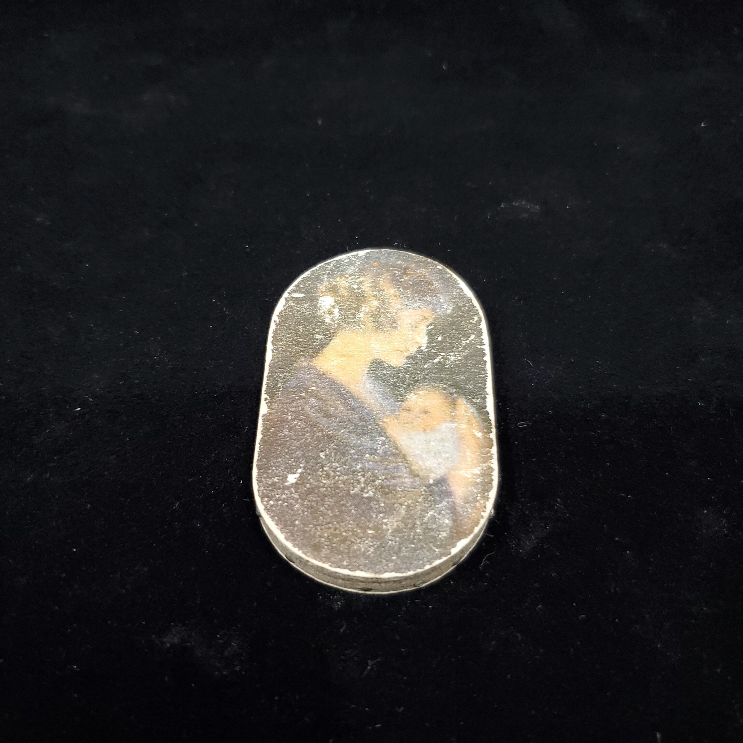 Advertising pin cushion. Flat disc type, oval shape. Mother and baby picture on one side. The Prudential Insurance Co. of America advertising on other side.