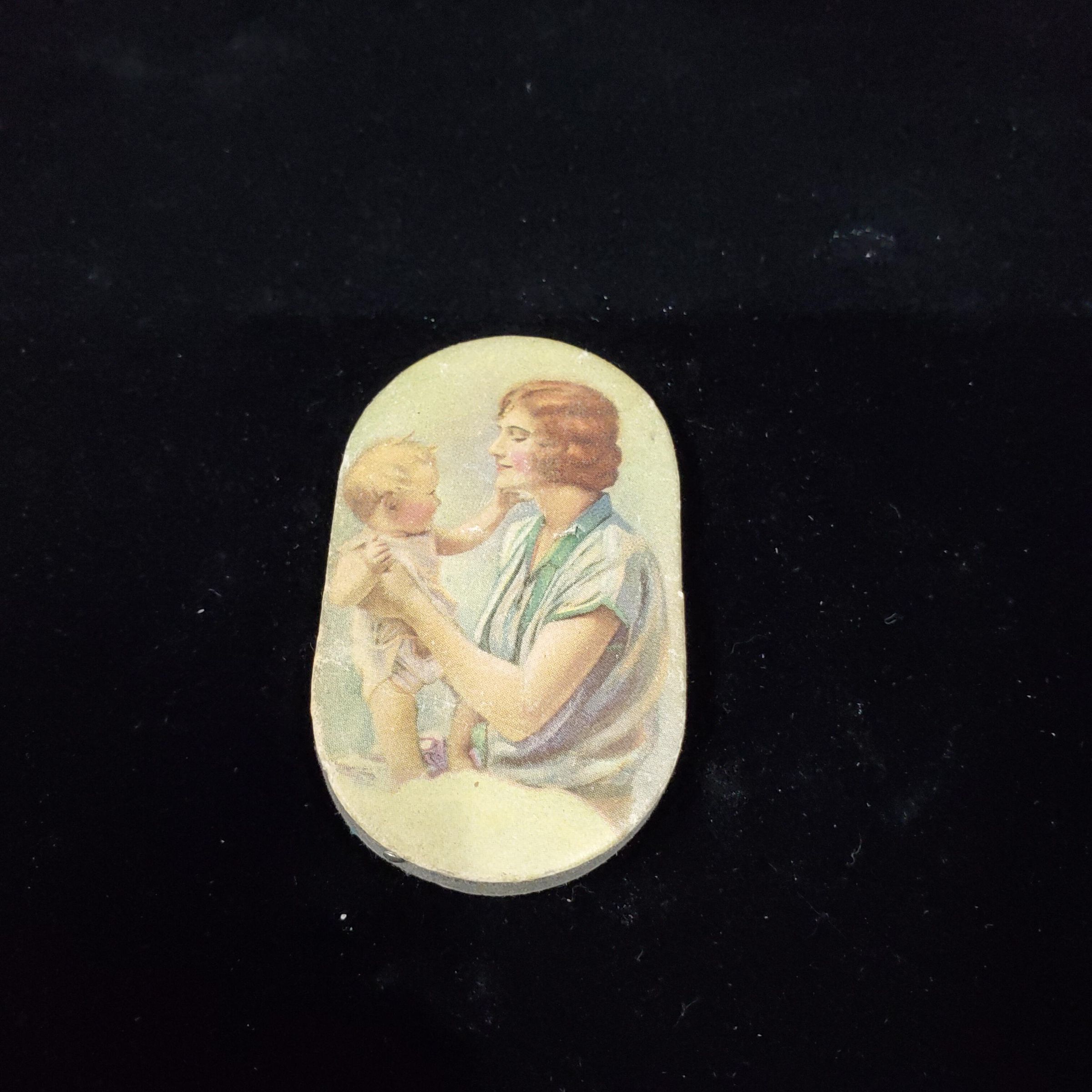 Advertising flat pin cushion disc. Colour picture of Mother and baby on front , back has advertising for The Prudential Insurance Company of America. Betwen is a thin brown cushion for pins.