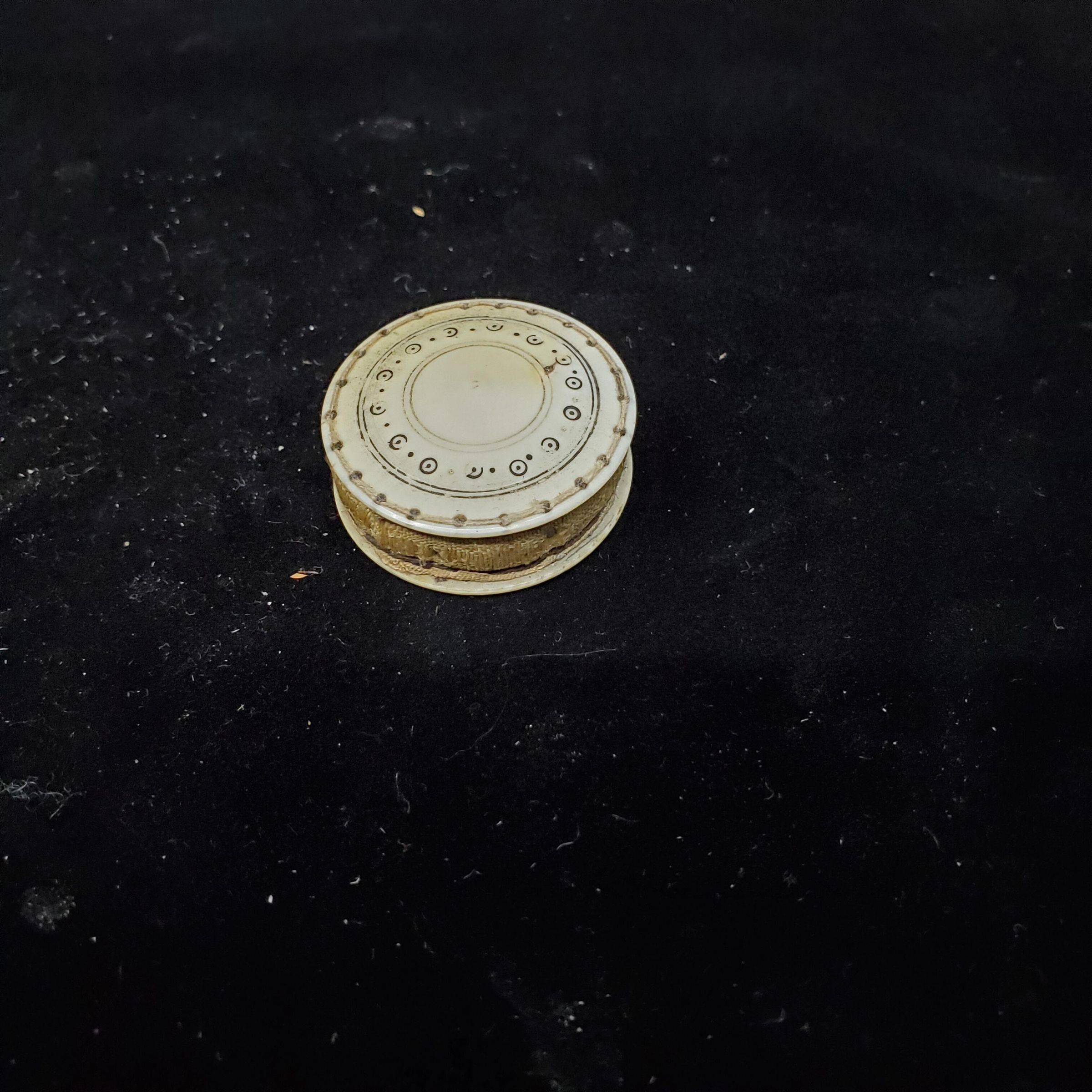 Ivory disc type pin cushion. Circular shape, the ivory has a design of circles and dots both front and back. Pin cushion was a light brown colour.