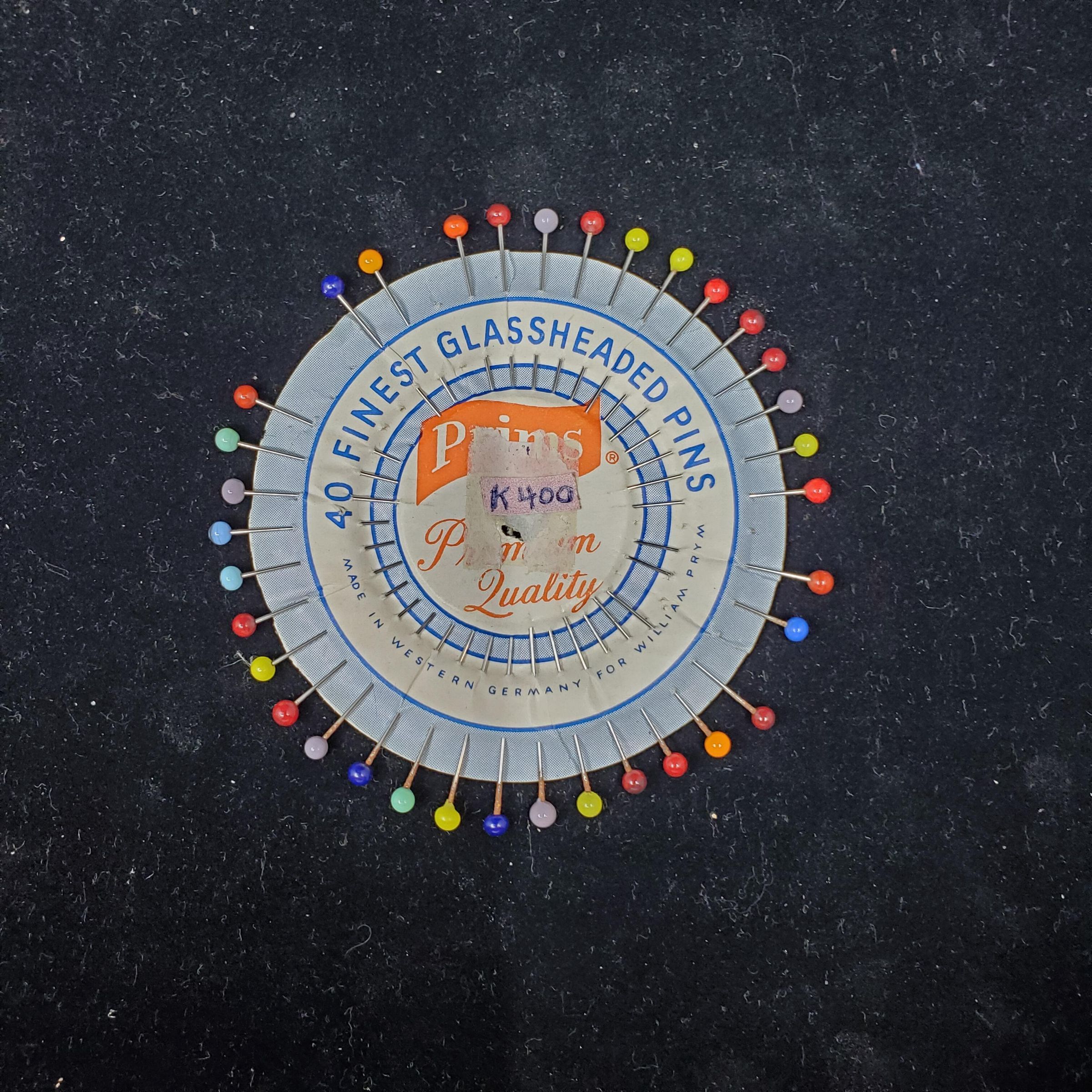 Circular light weight cardboard pin card.ÓPrims Premium Quality 40 Finest Glassheaded Pins Made in Western Germay for William PrymÓ Short straight pins with coloured glass bead tops around.