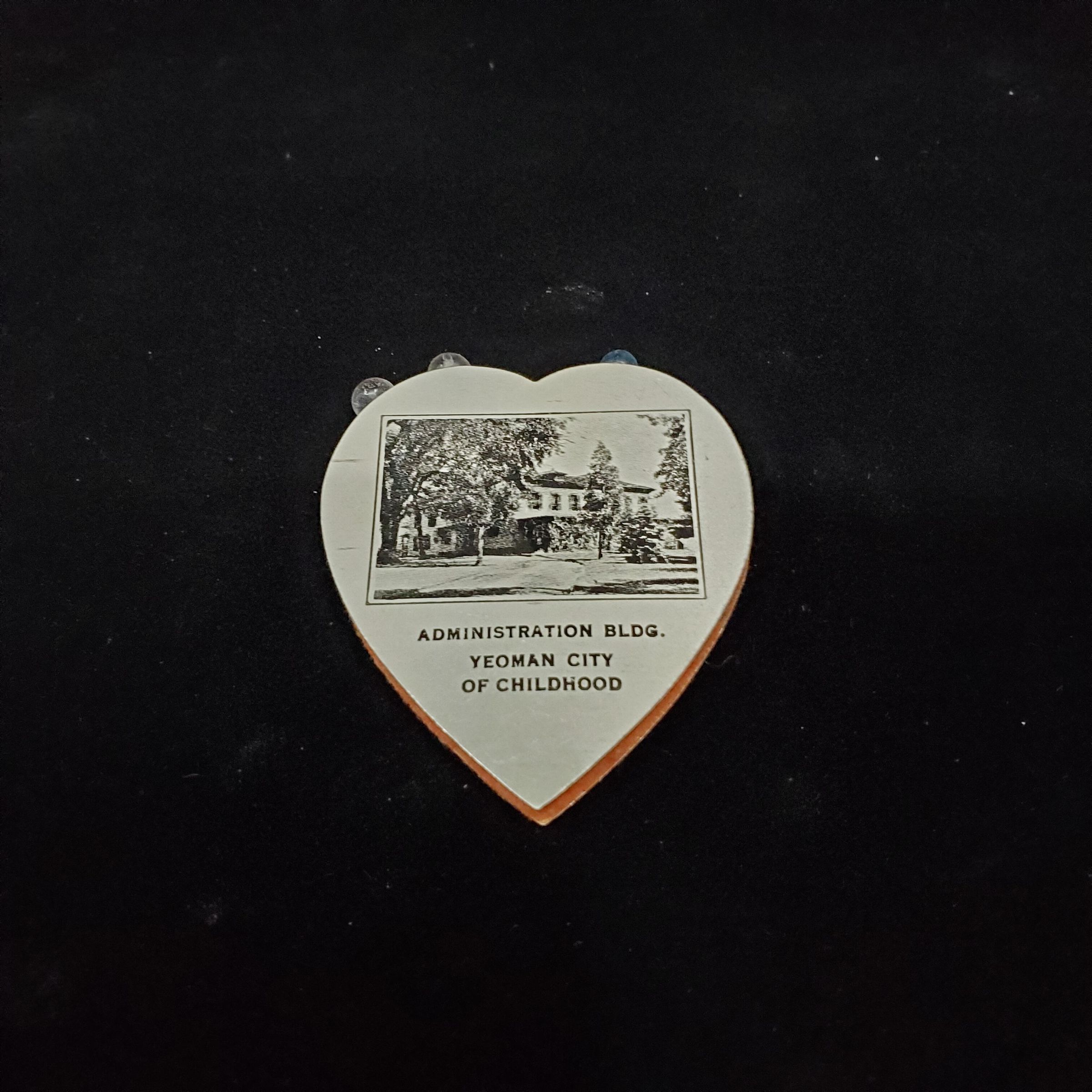 Flat heart shaped pin disc. Background is a gray colour - not white as shows up in picture. Black and white picture of a building on top piece with ÒAdministration Building Yeoman City of ChildhoodÓ underneath.Back has printin in green ÒThe Brotherhood of American Yeomen Fraternal LegaL Reserve Insurance Des Moines IowaÓRed cushion between back & front.