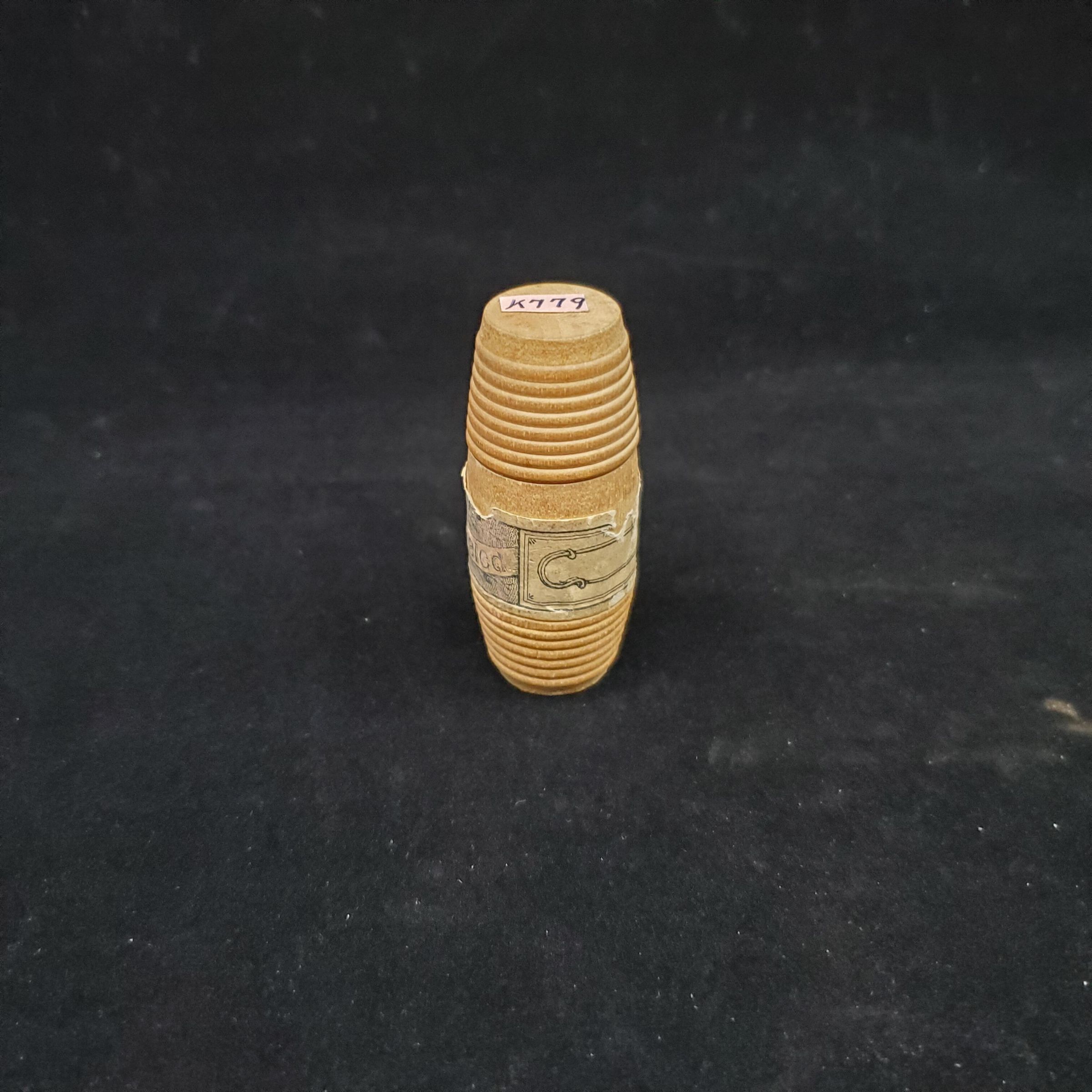 Pin holder, wooden, barrel shaped. Light tan in colour, ridging on top and lower part of barrel. Paper label shows Safety Pin - kind used on skirts.- and reads ÒSafety Pins NickeledÓ