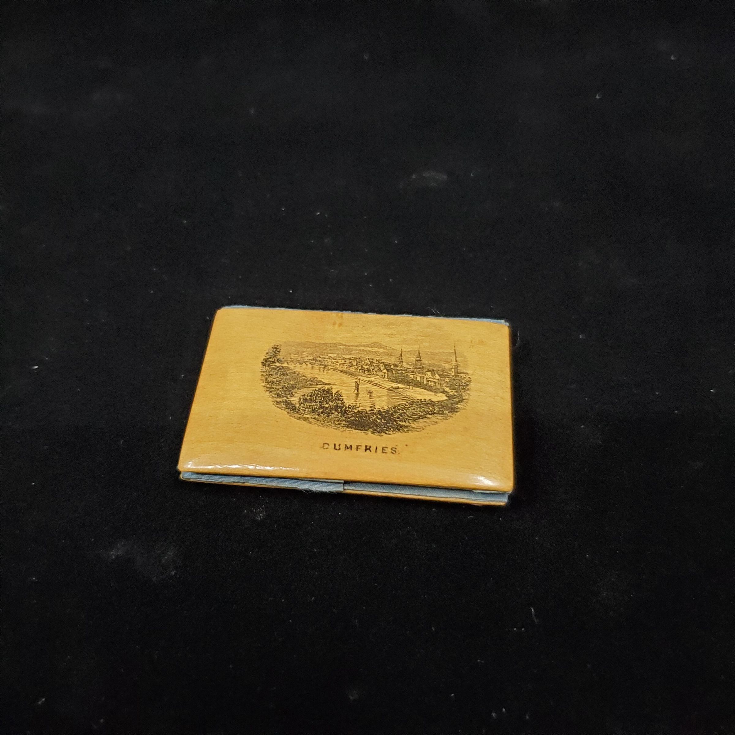 Book type wooden needlecase. Mauchline Ware with a Transfer print on front. Print of ÒDumfriesÓ. Blue velvet hinge back. Blue lining inside with needle packet & needles one side, white flannel other side. Most Mauchline was made from Sycamore wood.