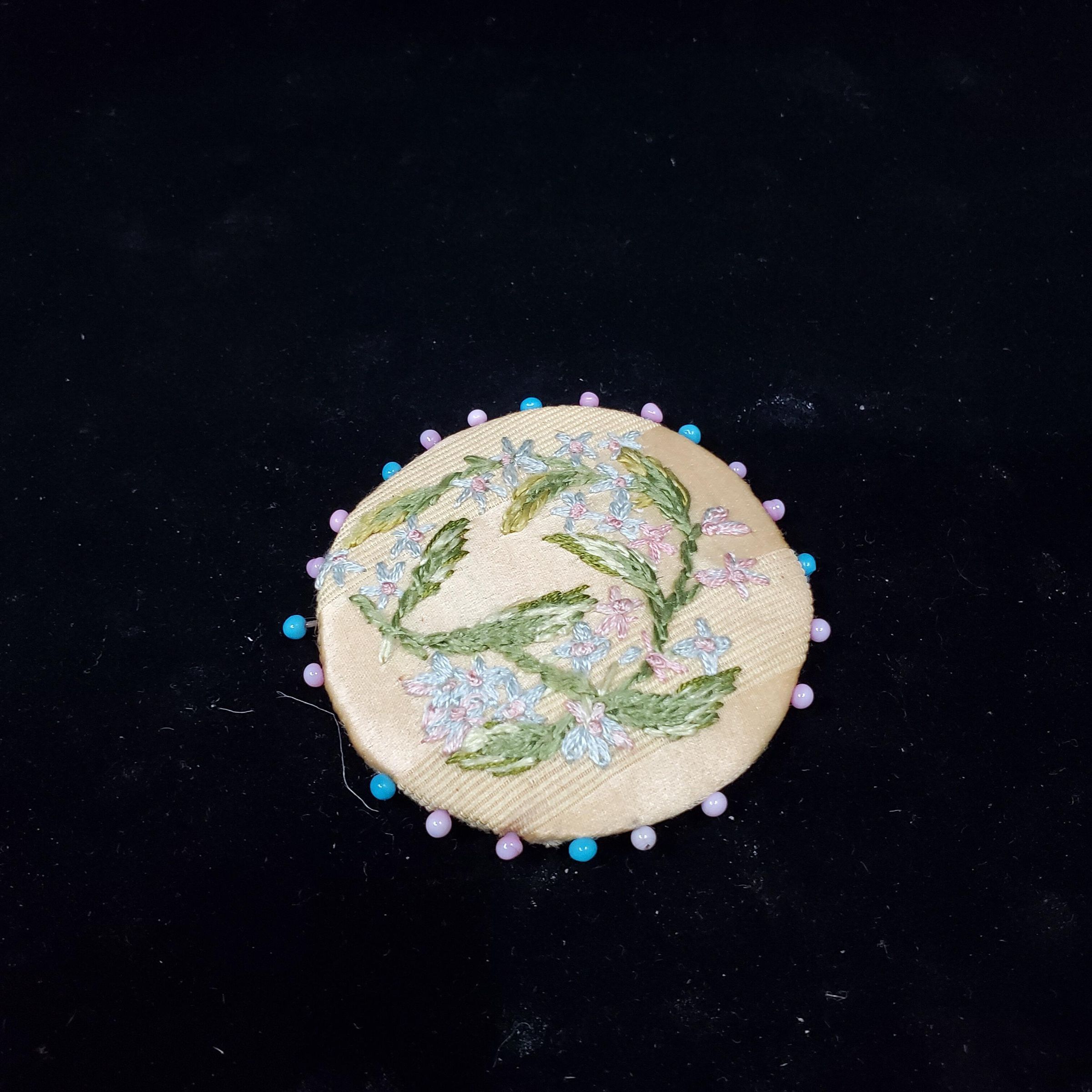 Flat pin disc pin cushion. Yellow satin background cloth with lovely embroidery on top side. Green leaves, pink and blue flowers, many types of stitches. Back has a pale yellow satiny maerial with dots woven in. Pink and blue headed beads inserted between top and bottom. No cushion .