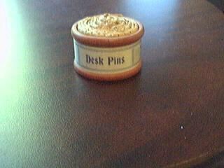 Pin Roll in round wooden case with open top. Paper label on case reads Toledo Desk Pins No.4 op open. Paper roll of common pins inside. Paper roll with pin marks still there. No pins.