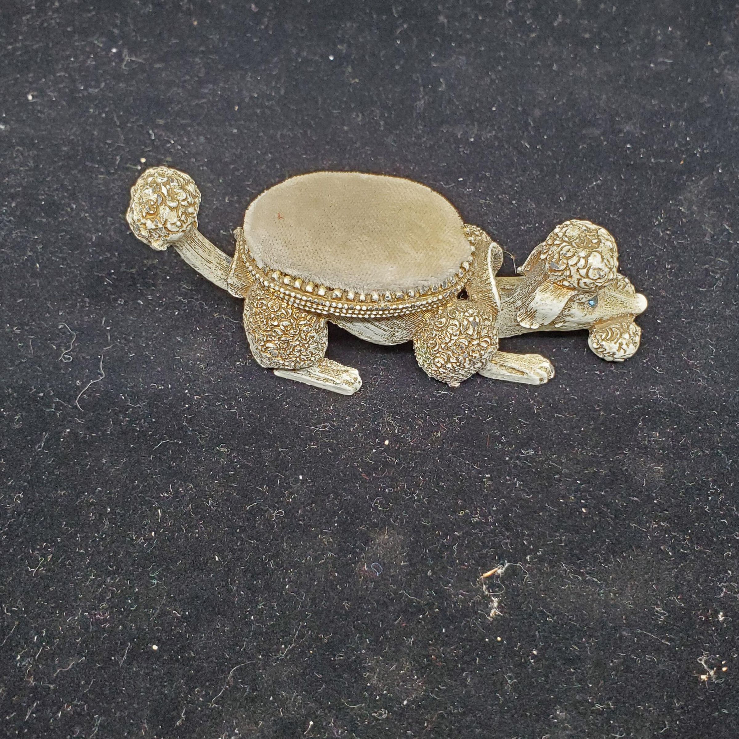 Metal pin cushion in shape of French Poodle dog with bone in his mouth. Metal is white wi th circular marks resembling curls. Dog is constructed so that tail and head move. Cushion, tan velvet, is on back of dog. Blue glass for eyes. Underneath mark which reads Fiorenza (Florence, Italy)