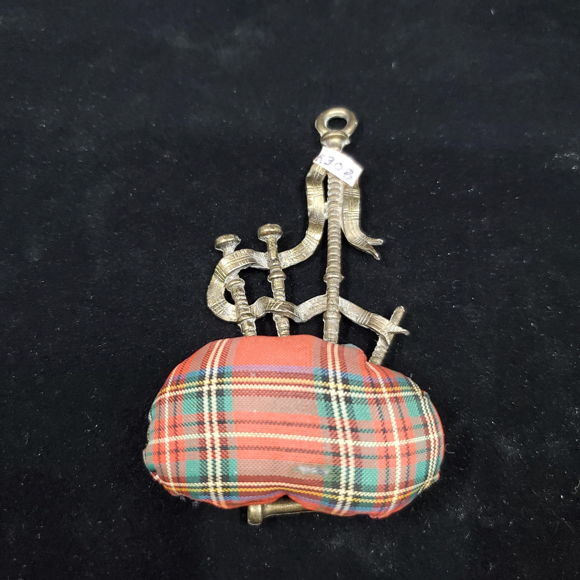 Pin cushion in form of bag pipes. Pipes, 4, in brass with banner through them. Cushion in red, green and yellow tartan. Cushion has brass loop on back which could be used as hanger and also has extended one pipe to have a loop at end for hanging. No marks.