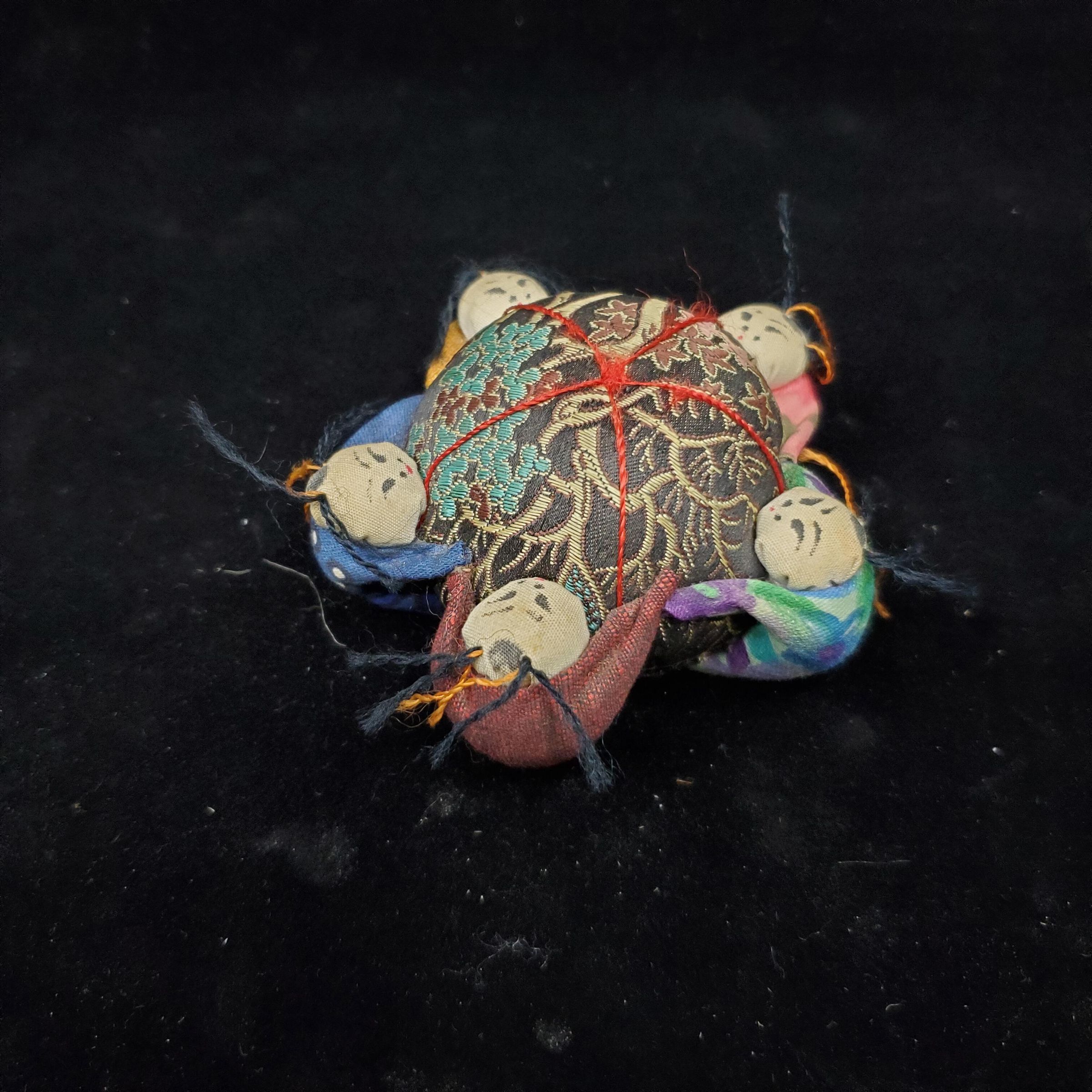 Oriental pin cushion. Black tapestry cloth cushion in the center. Five Oriental bodies with pigtails clutching the center cushion.Each body clothed` in a different material.