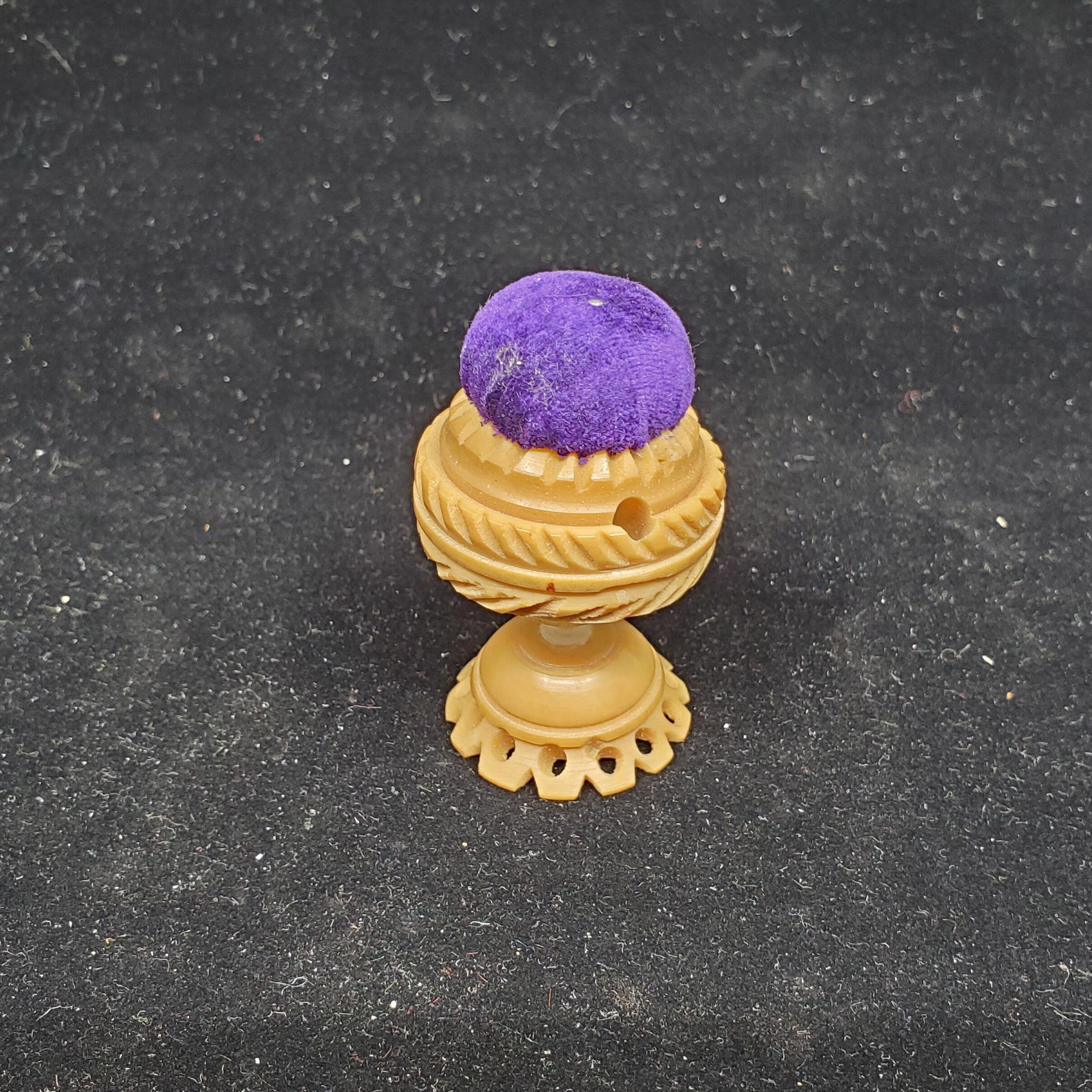 Vegetable Ivory pin cushion. Carved pedestal in vegetable ivory of a light brown color. Small piece of real cream coloured ivory joining base to urn on top.Royal purple velvet cushion in top.There are 2 holes in side of top part - one each side.