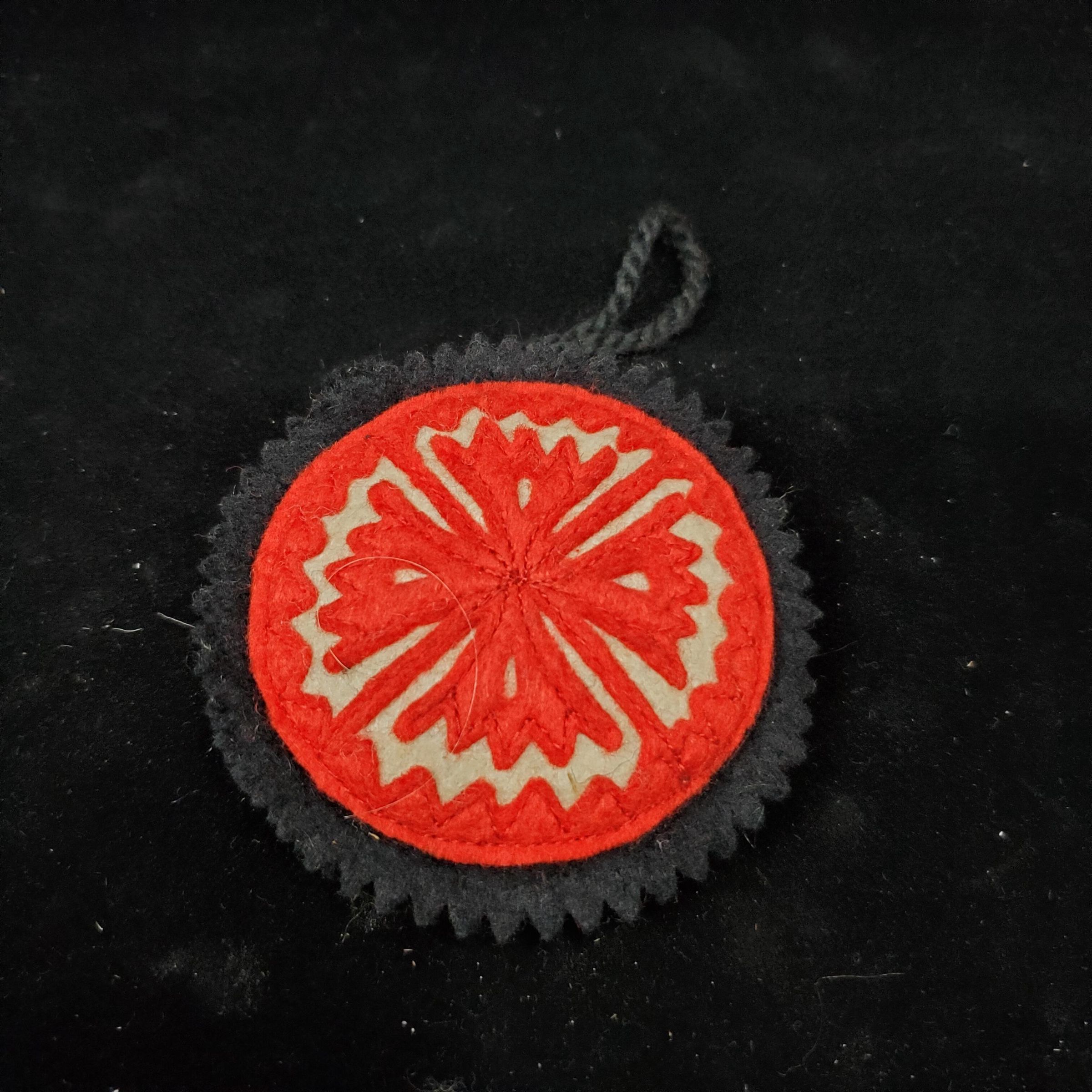 Hand crafted pincushion from Hungary. Black, cream and red felt colours. Cut out design in red with cream background. Black cord for hanging.