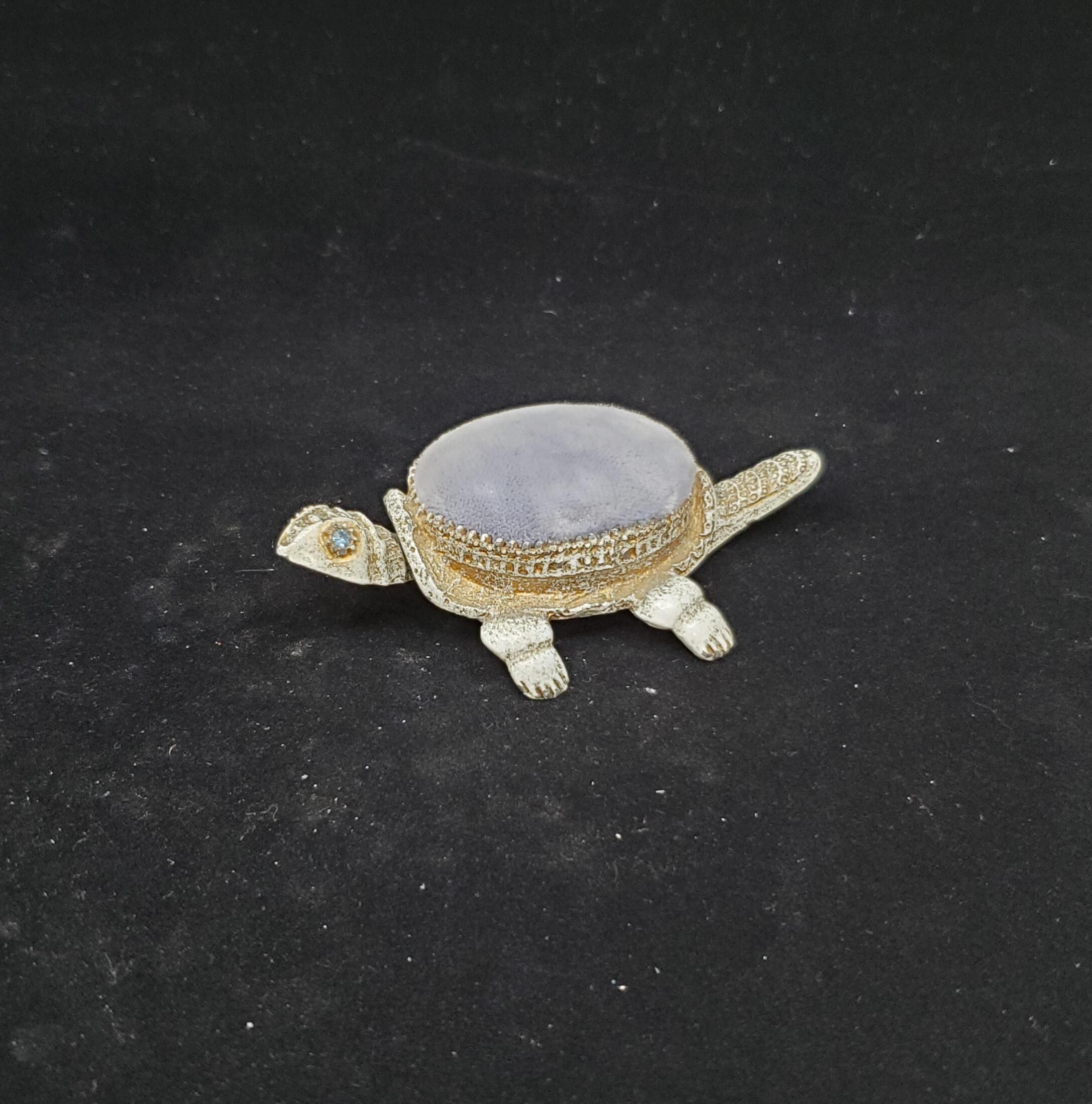 Heavy metal [in cushion in shape of turtle. White, gray with gold metal . light blue glass eyes. Both head and tail are moveable. Blue - gray velvet cushion on back of turtle.