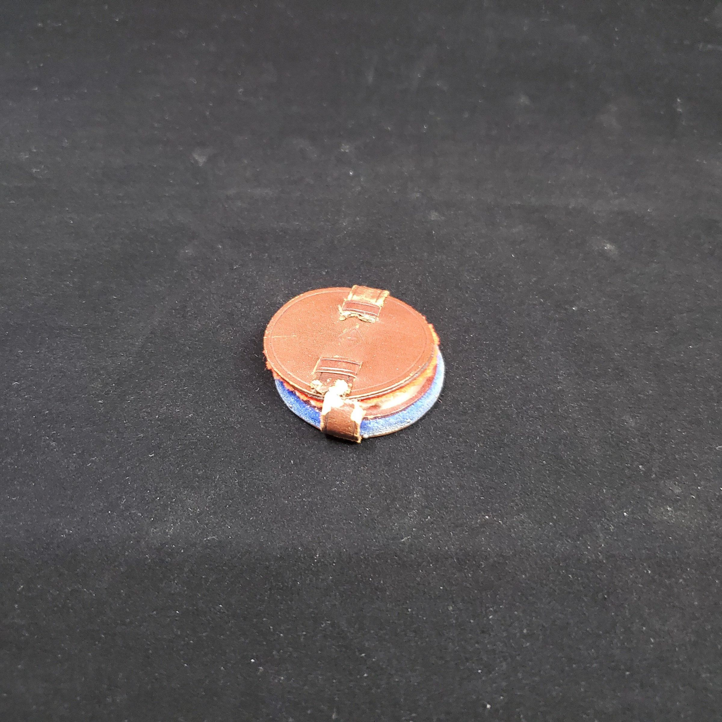 Round leather combination case with leather strap closure. Brown leather with stamped design of a candle in a diamond shape. Inside blue velvet pincushion backed by leather on out side mirror inside.2 flannels, red and white for needles, stitched to brown lining on back of the outside leather disc.