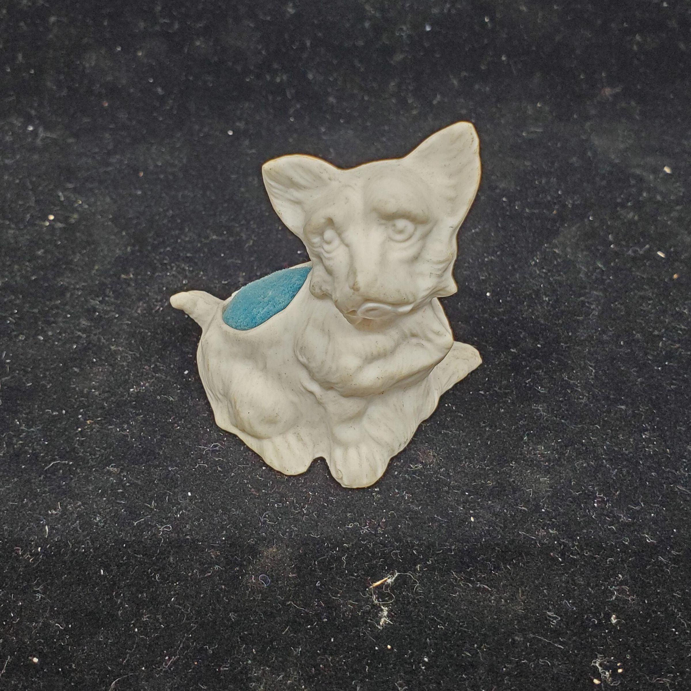 White bisque pin cushion in shape of dog. Small Scottie dog with blue velvet cushion in back. Seem to be numbers and something written on bottom but can't read it.