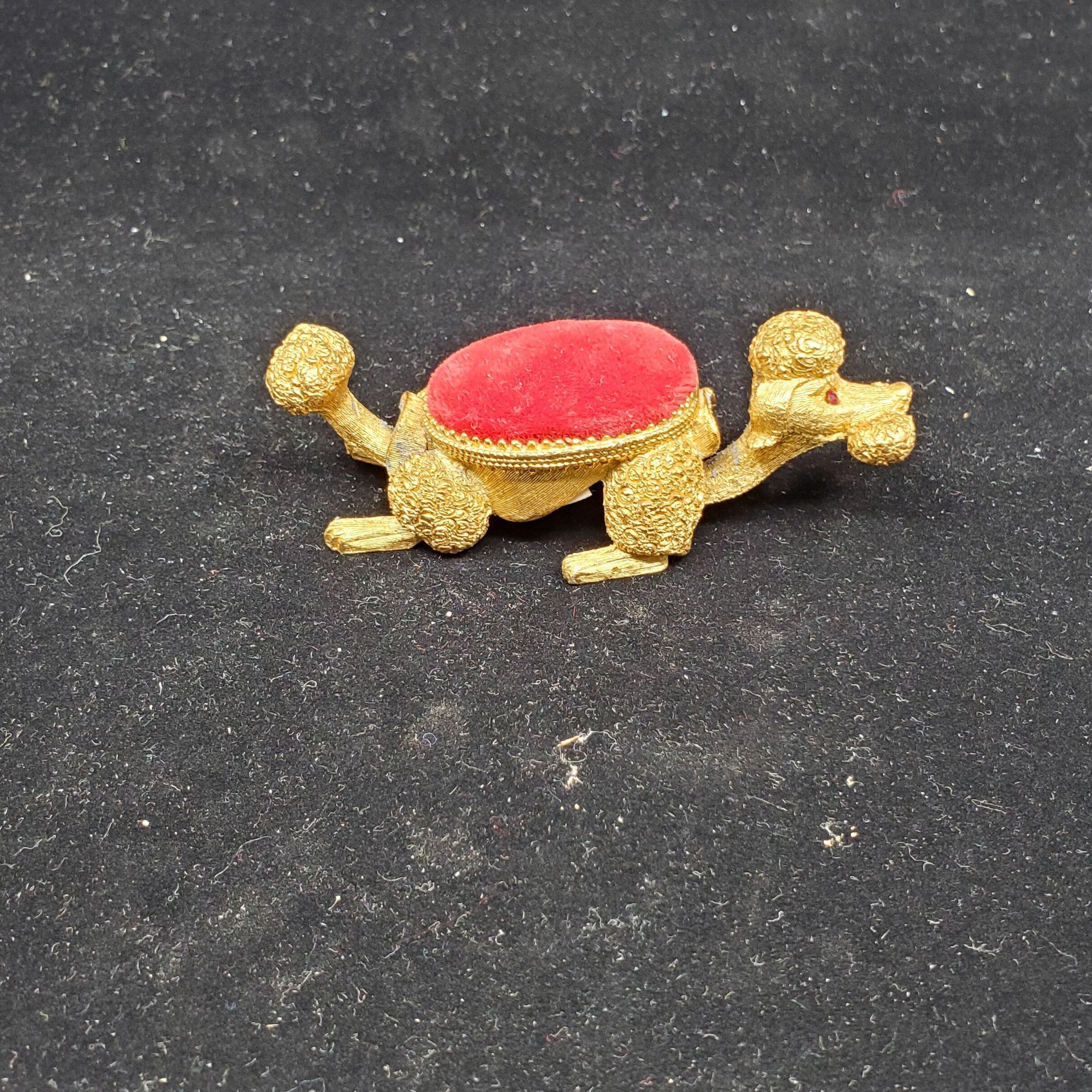 Gold coloured metal French poodle pin cushion. Red velvet cushion on back. Moveable head and tail. Red stone eyes. Stamped underneath Florenza (Florence).