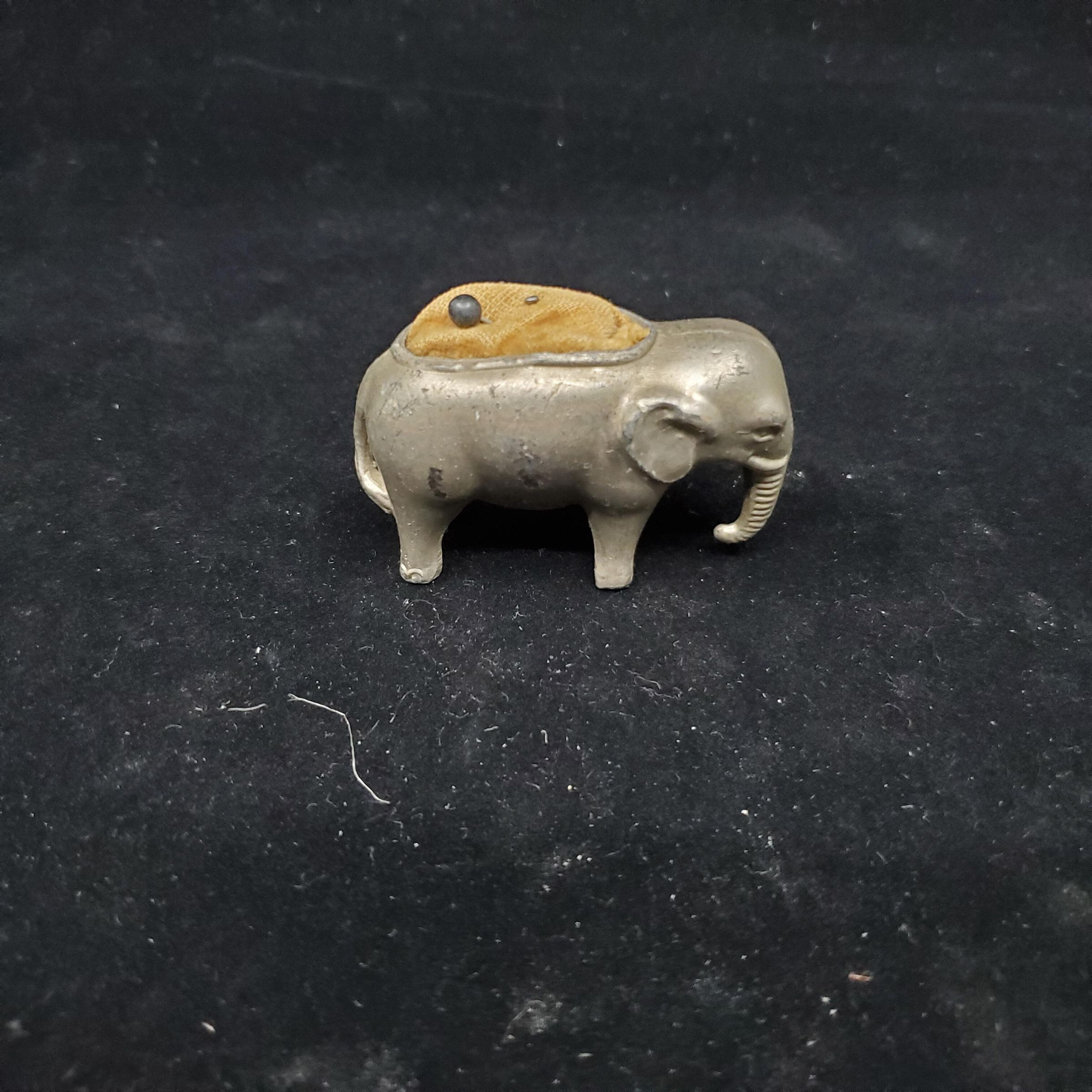 Pin cushion elephant. Silver coloured lsphant. Stamped Germany undernesth. Cushion - - light brown, crumpled, in back of elephant.