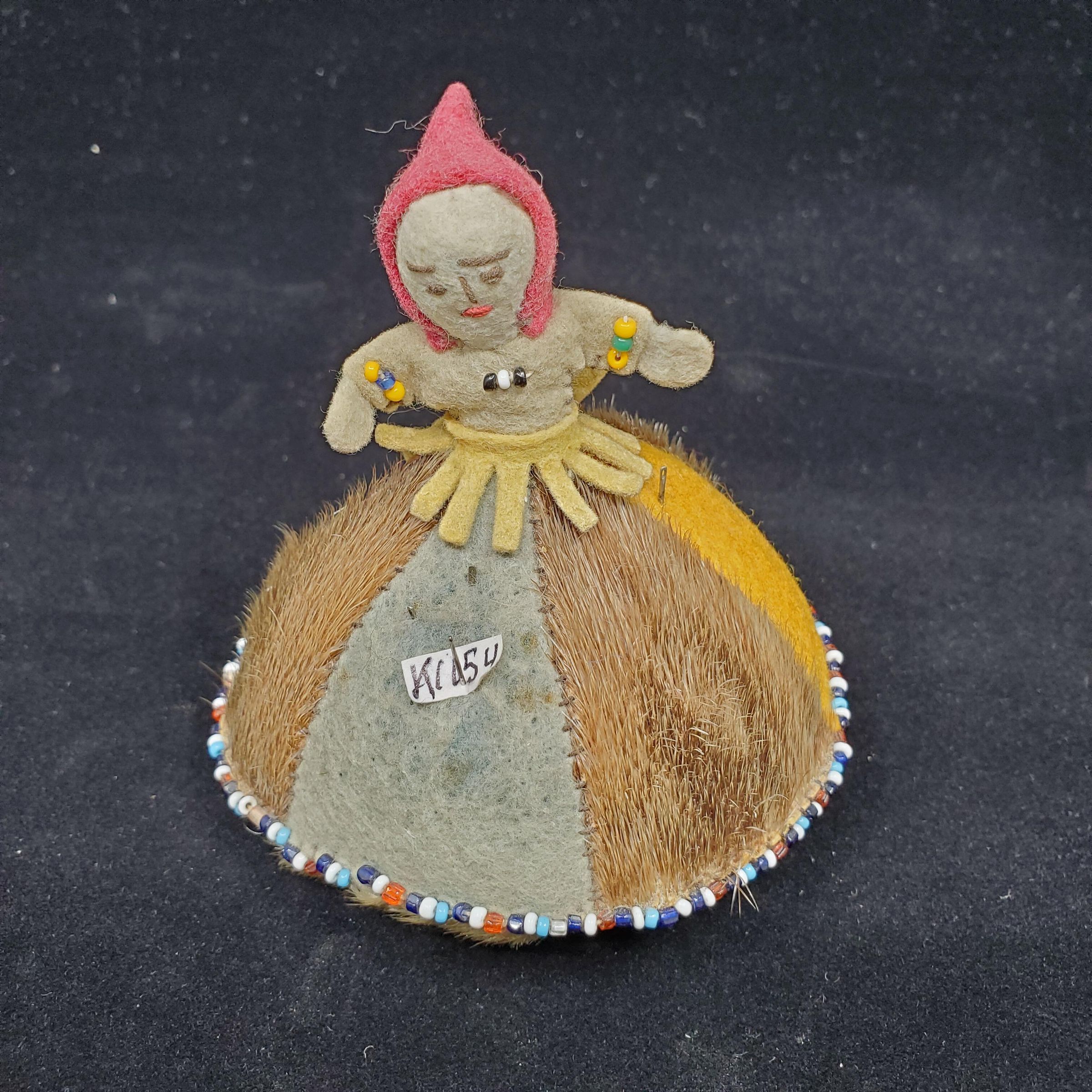 Inuit (*Eskimo) doll pin cushion. Felt face with embroidered features. Red felt cap, beading on sleeves and top. Skirt has alternating felt and sealskin triangles joined to seal skin bottom with beading. Felt triangles coloured felt - yellow, blue and pink.