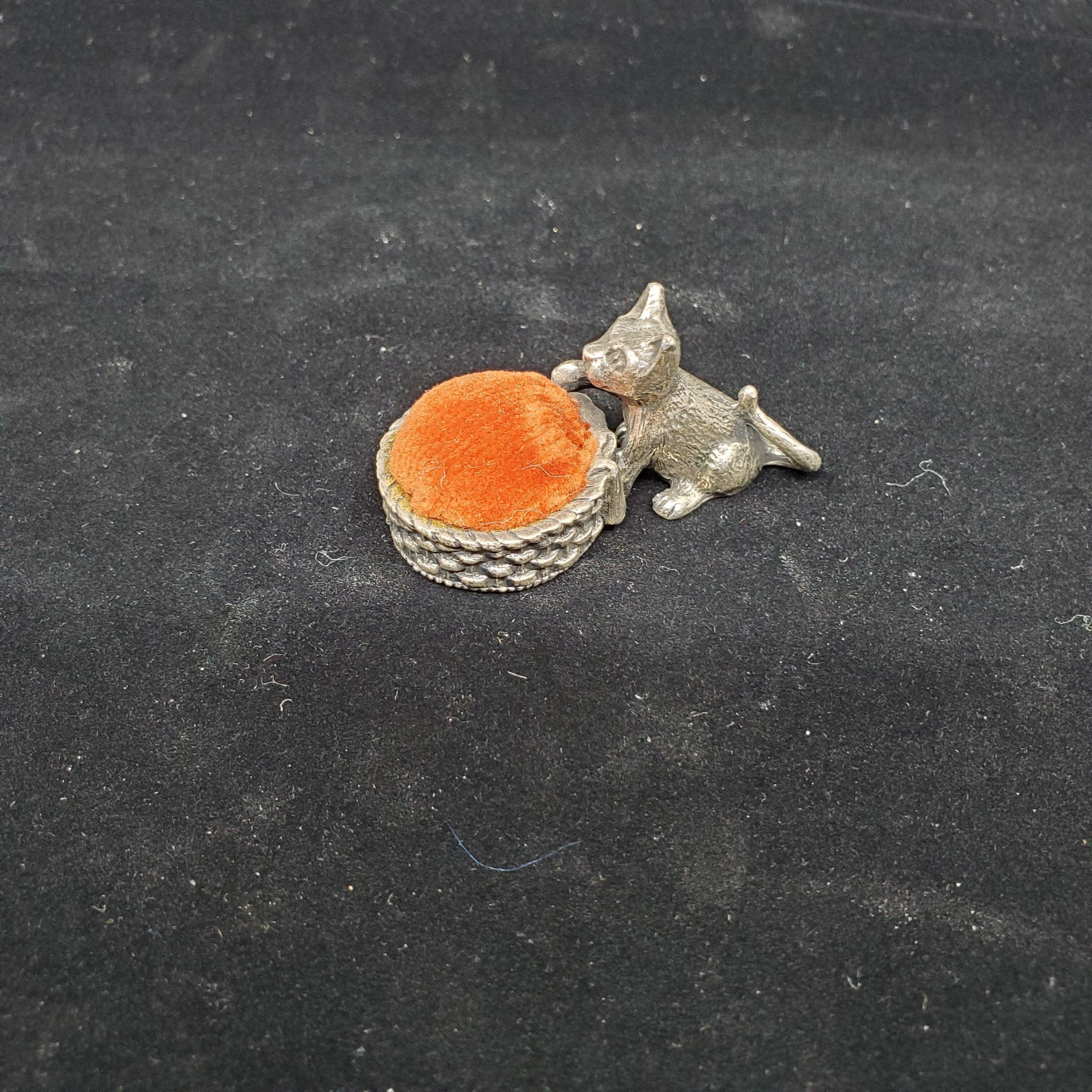 Cat holding woven basket with pin cushion. Pewter silver coloured cat sitting with paws on low silver coloured woven pewter basket. Orange coloured velvet ,plush,pincushion in basket. No marks.