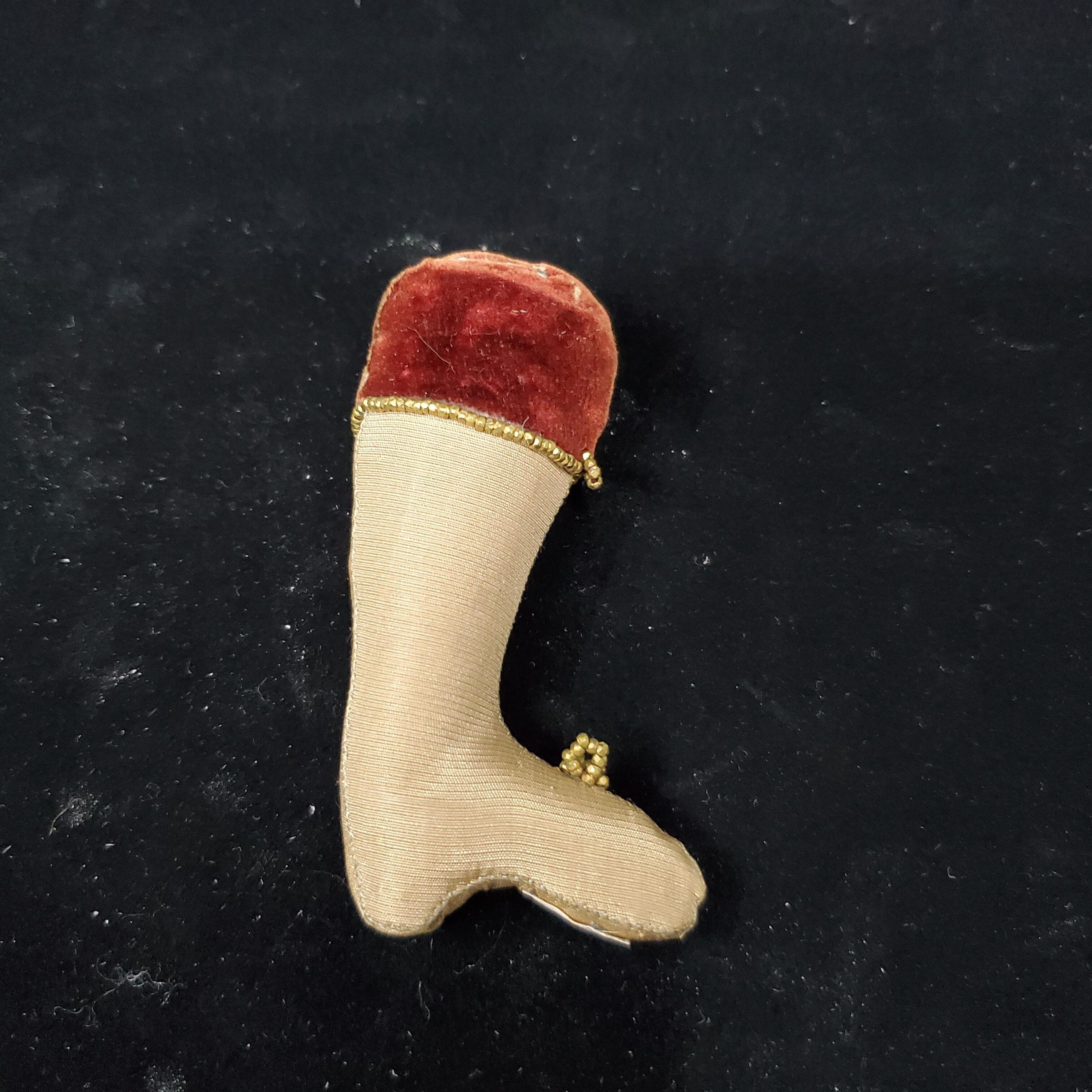 Pin cushion in shape of high boot. Flesh coloured - light tan - boot and leg topped by band of brownish-red velvet at and over top. Gold coloured beads at join of velvet top and boot colour and a bead bow on top of shoe. Hand stitching visible in places.