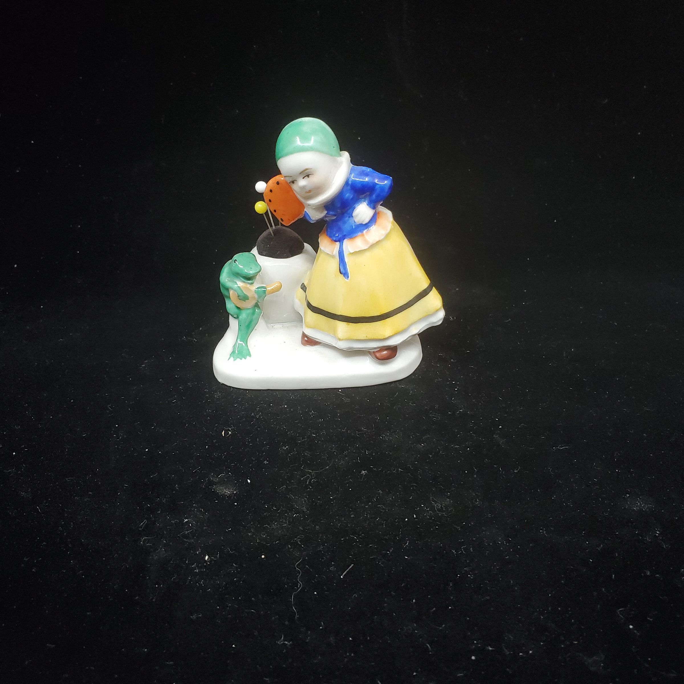 Ceramic pin cushion. White glazed oval base .Whoite urn with purple velvet pin cushion. Green frog sitting in front of urn playing banjo. Young lady in green hat, blue blouse, yellow skirt , orange fan standing other side of urn. Stamped 11432 underglaze.