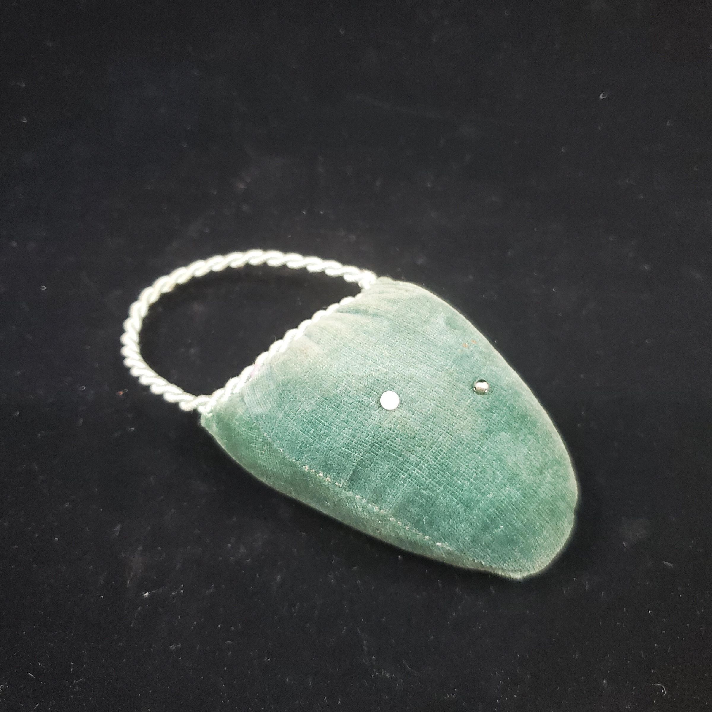 Green Velvet pincushion with wrist cord. Triangular shape with green cord across top forming a carrier for wrist.