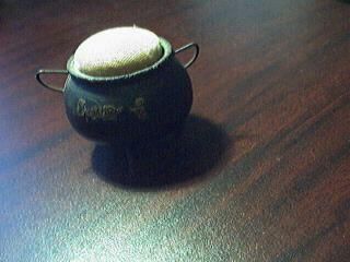 Souvenir pin cushion, bog oak. Made in the shape of a small pot with handles. Beige cushion. Set on 3 legs. See also K313, K1229