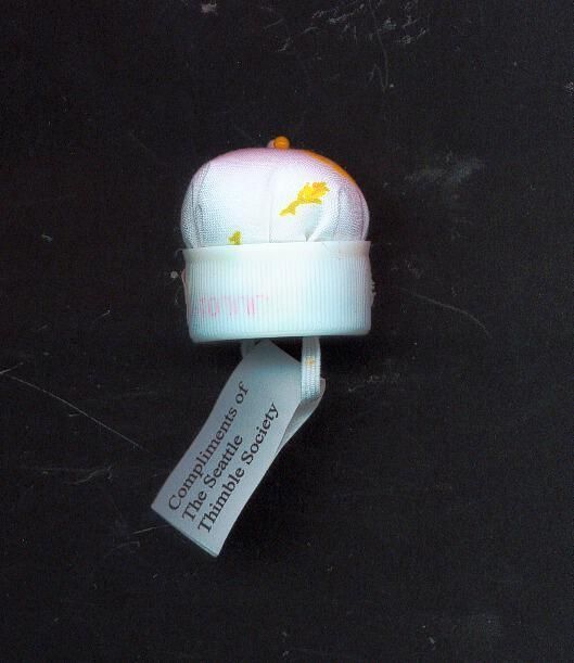 Pin cushion made from white plastic bottle topo with cloth covered cushion inserted. Card attached which reads Ò Compliments of the Seattle Thimble Society Elastic in bottom so, it can be worn on finger.