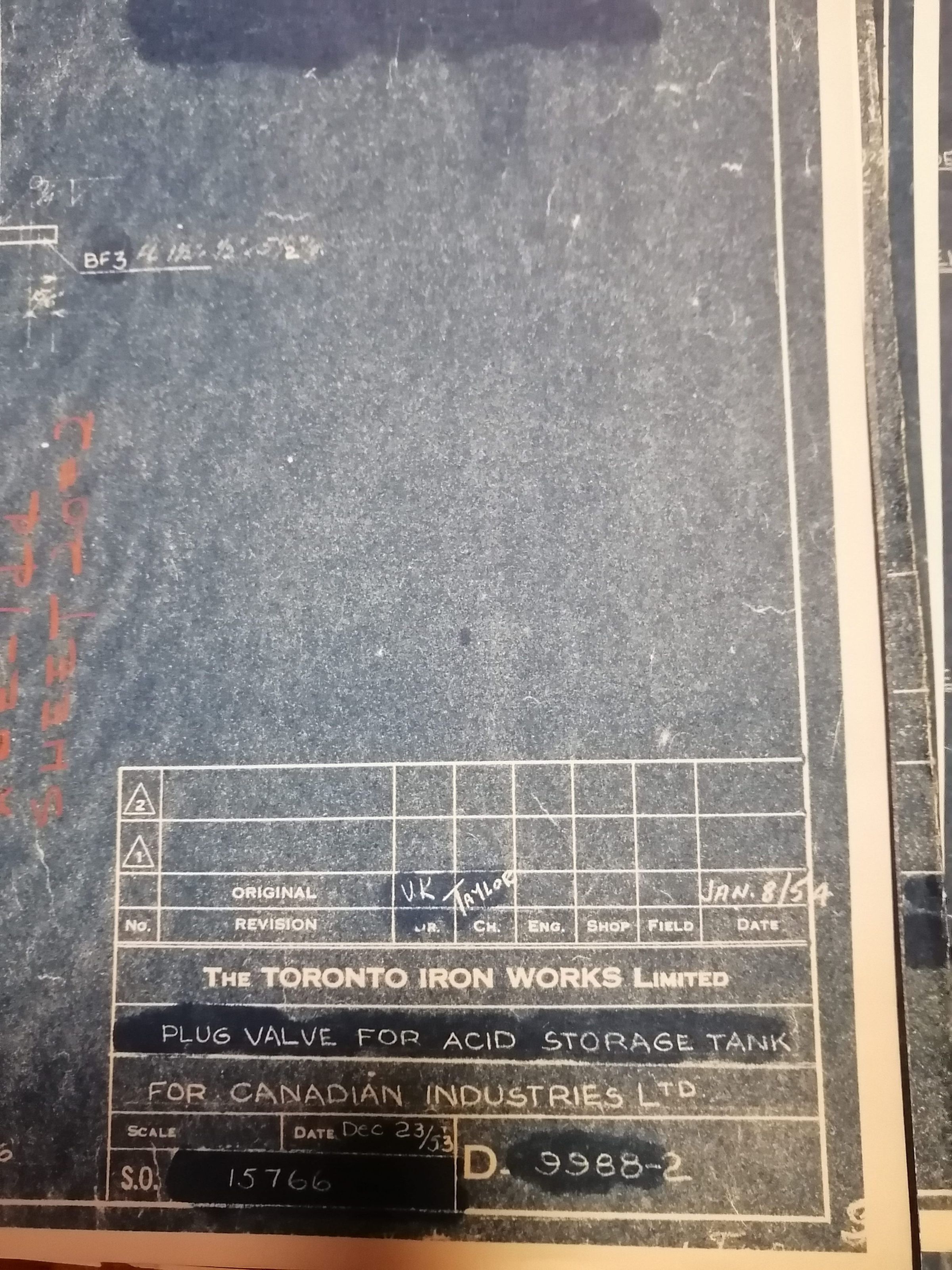 Plug valve for acid storage tank. The Toronto Iron Works. Technical drawing.