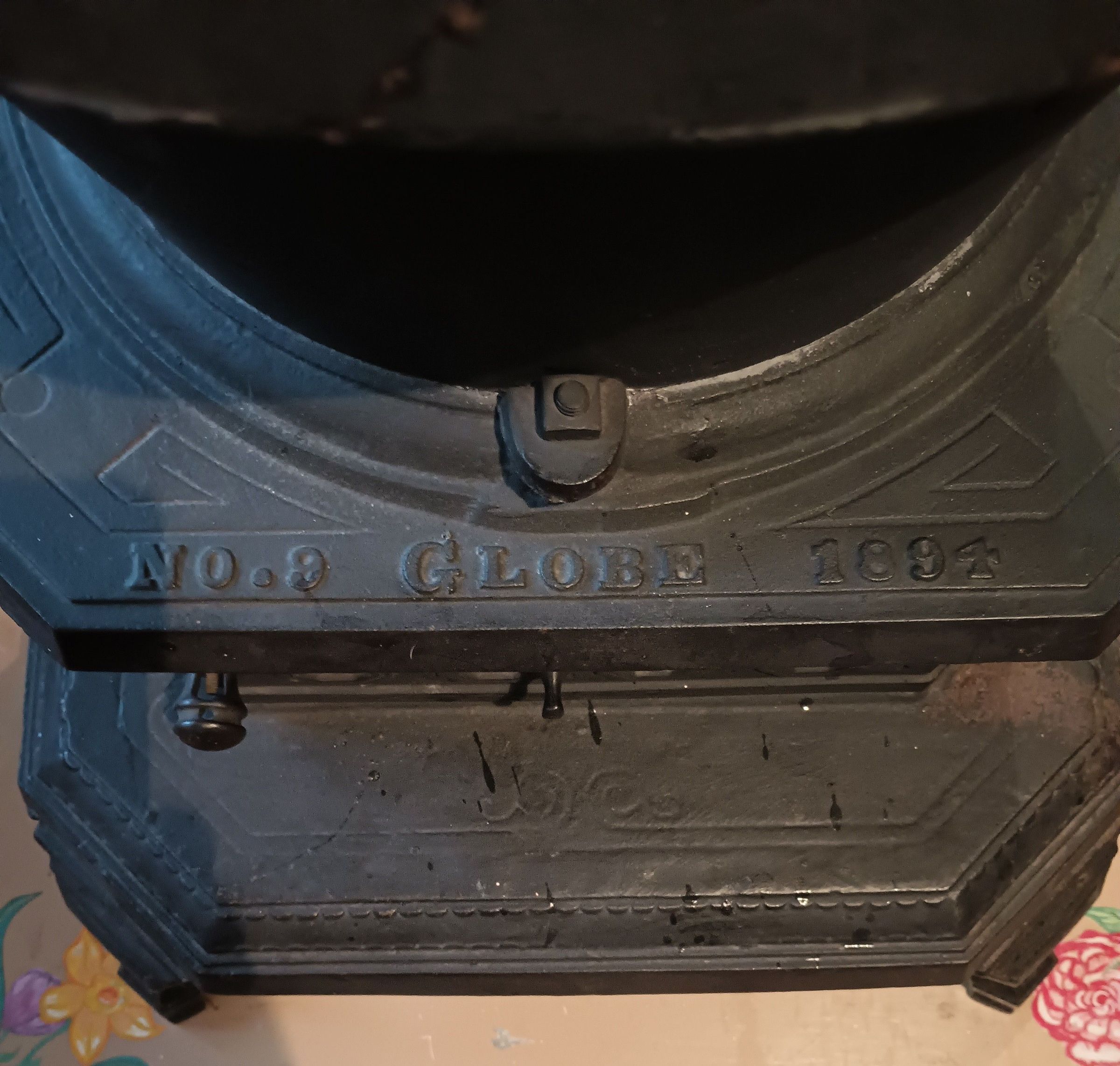 Cast iron pot belly wood burning stove manufactured by Albion Ironworks, Victoria, B.C. Model 'No. 9 Globe 1894'
