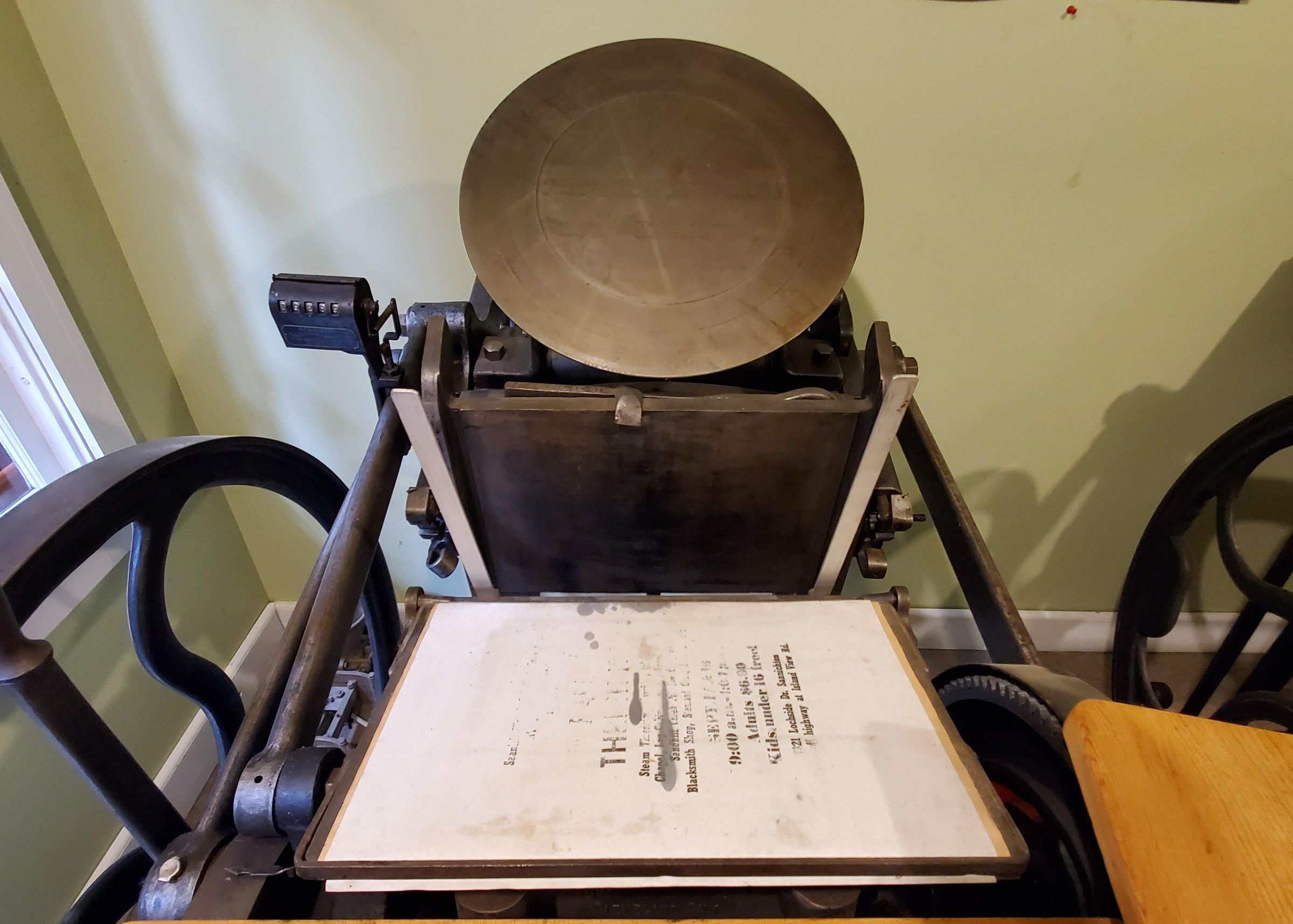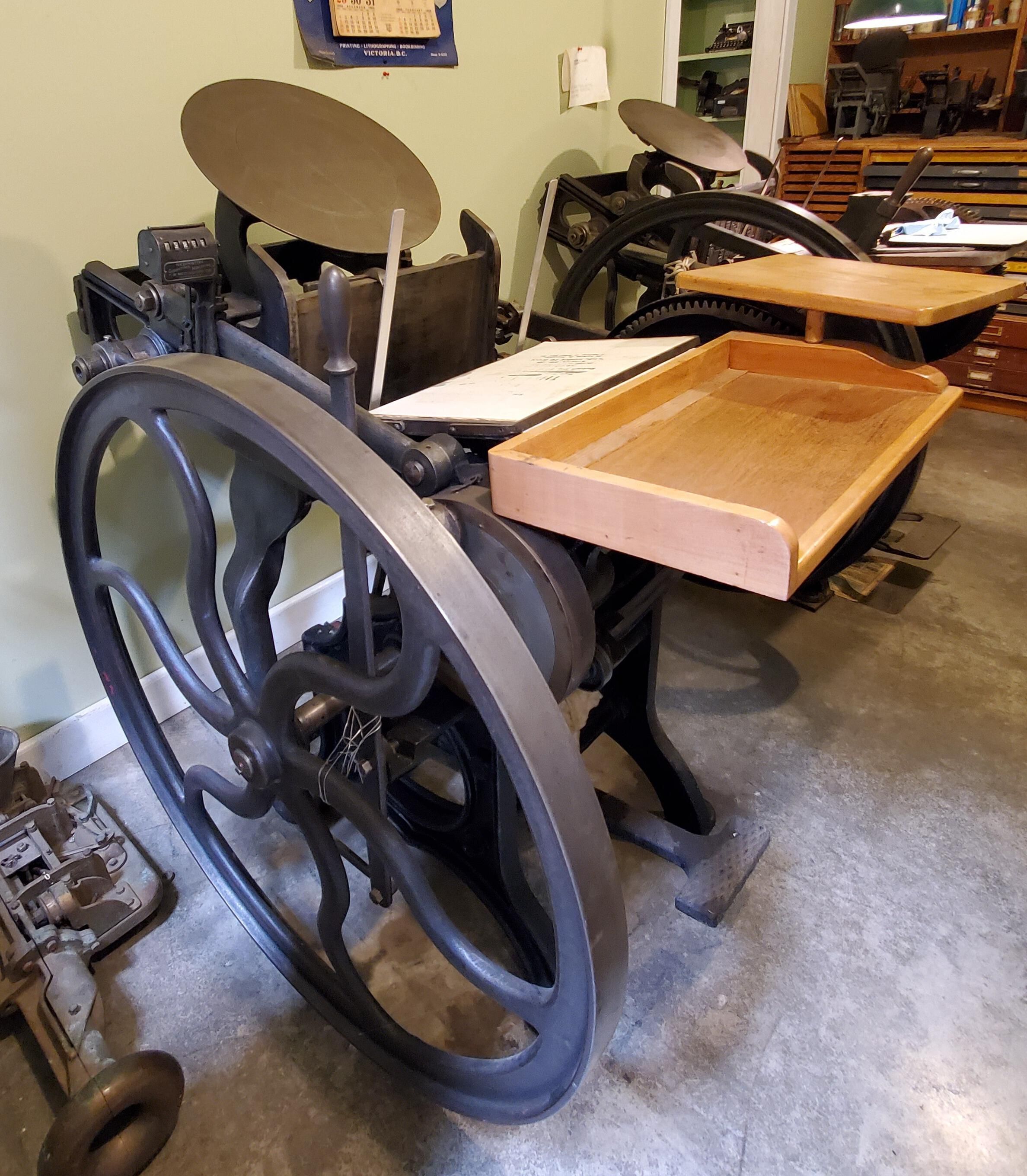Chandler & Price Gordon Press 10" x 15" letter press printing machine. This type is handset and locked into a Chase, which, after it has been removed from the proofing press is mounted into the machine. The rollers ink the type and paper stock is hand fed onto the platen. After the impression is transferred to the paper from the inked type. It is removed by hand. The operator of the press uses one foot to power the machine